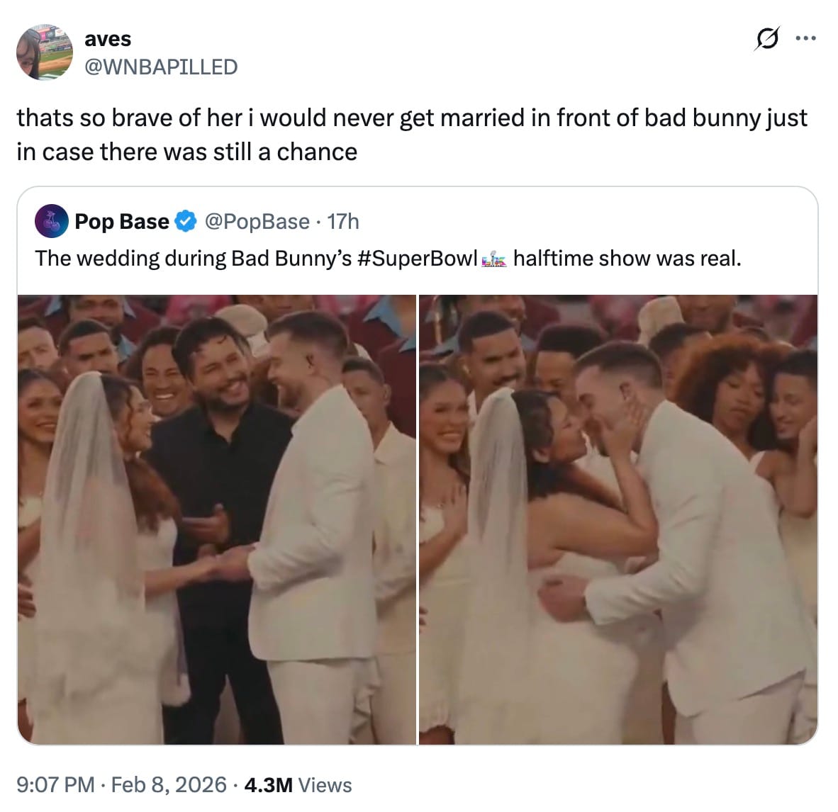 In just 13 minutes, Bad Bunny also managed to include an actual wedding in his performance, complete with a reference to children sleeping on a row of chairs, as seen and experienced at countless family functions. As it turns out, the couple had invited Bad Bunny to their wedding ceremony, but he pulled an Uno Reverse card and said, "Just have it at my half-time show.” Whoever was supposed to be the Best Man might just have to hand that title over.