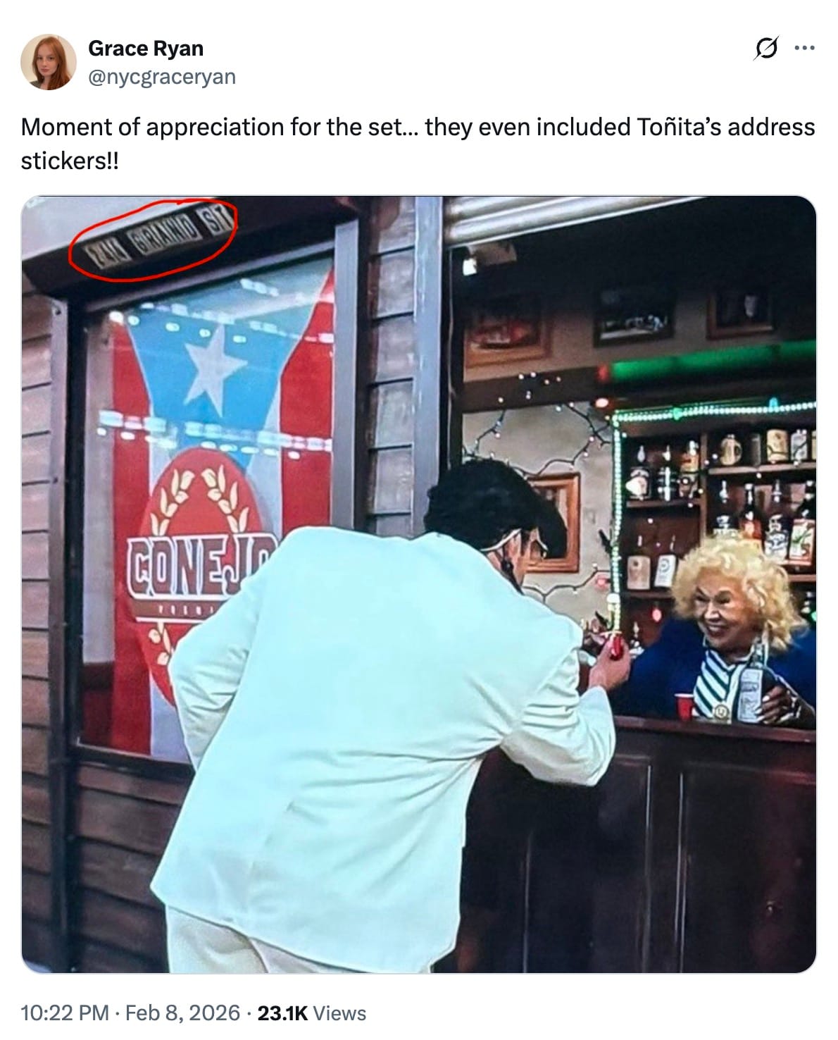 Throughout the show, Bad Bunny coursed through sugarcane fields in reference to Puerto Rico's colonial background. He also touched on the semi-regular power blackouts on the island by scaling a faulty electricity tower, and fell through the roof of “La Casita,” which has become a staple set in his performances and tours. Bad Bunny's set further blended Boricua and Nuyorican references, ranging from a coco frío (coconut water) stand and a piragua (shaved ice) cart to a makeshift city block referencing the La Marqueta strip in East Harlem, a major diasporic Caribbean and Latin American vending hub. Beloved cultural matriarch Toñita, who has owned and managed the Caribbean Social Club in Brooklyn for over half a century, also made a cameo appearance in a replica of the space's home-y bar, emphasizing the singer's appreciation of New York City's diasporic Puerto Rican presence.