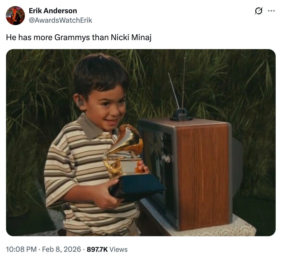 The National Football League's (NFL) selection of Bad Bunny caused quite a stir last fall, eliciting uproar across the Trump administration due to the singer's longstanding anti-ICE commentary and, frankly, because of racism and xenophobia — even though the artist is a United States citizen. In protest of the 31-year-old singer, the conservative advocacy group Turning Point USA, co-founded by Charlie Kirk, also programmed its own “All American Halftime Show,” boasting a performance by none other than Kid Rock. While the jokes write themselves in this instance, netizens were quick to needle the far-right’s talent pool even further by pointing out that even the little boy in Bad Bunny’s performance has more Grammies than vocal Trump supporter Nicki Minaj …