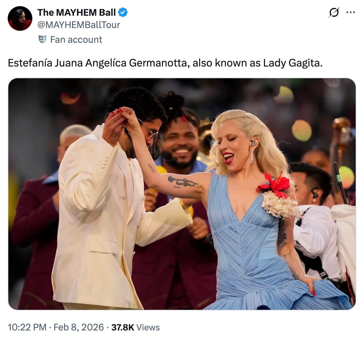 lady gaga showing up to bad bunny’s halftime pic.twitter.com/t2vK9v8ujP