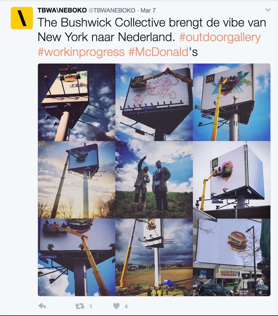Yes, graffiti and hip-hop and bagels are authentic New York. And sure, McDonald’s is also a part of New York … though no more or less than it’s part of every other big city. If McDonald’s wants to sell bagels in the Netherlands as if McDonald’s bagels are a New York thing — uh, fine. America’s with you. But for McDonald’s to sell bagel–burgers in the Netherlands by tossing old-school graffiti and hip-hop and gentrified Bushwick and bagel-burgers into a blender, hoping to churn out the next baseball, apple pie and Chevrolet — uhhhh … we … uh … no. We have to take a stand. It’s 2017, so chew on this while you’re brunching, Bushwick: it’s the Bushwick Collective who’s bottled up your Bushwick vibe, added a soundtrack, and shipped it off to the Netherlands, all for the New York Bagel Supreme.