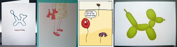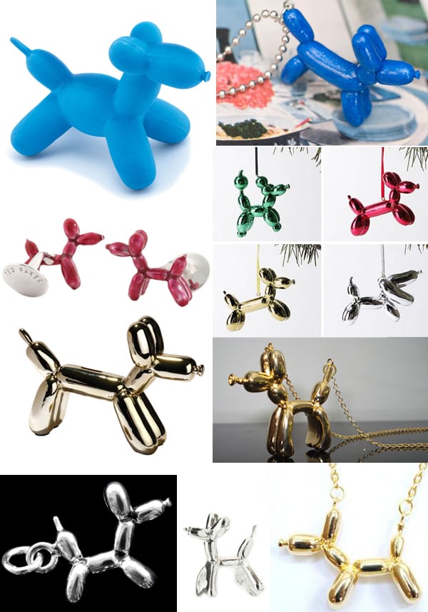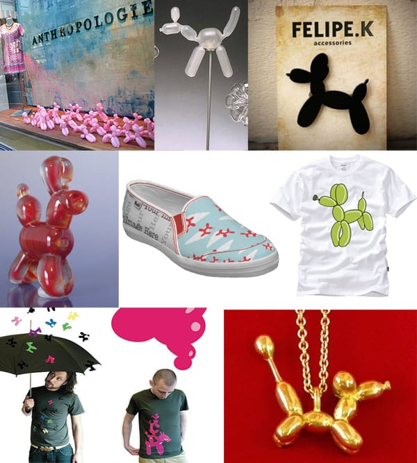 Image sources: t-shirts (1, 2, 3, 4, 5, 6), balloon dog doggie toy, glittery balloon dog necklace, Ted Baker balloon dog cufflinks, balloon dog Christmas ornaments, balloon dog piggy bank, Tu balloon dog necklace, balloon dog charm, sterling silver balloon dog, balloon dog necklace, balloon dog cards (1, 2, 3, 4), Anthropologie display, blow up balloon dog lamp, acrylic balloon dog, balloon dog glass sculpture, balloon dog shoe by Keds, white tee with green balloon dog, balloon dog umbrella & tees, balloon dog brass charm, a scene from the new animated film Despicable Me, a paper dog & balloon dog discuss their fears, “Pneumatic Anatomica” by Moist Production, screen capture of Park Life shop. A special thanks to Dusty Burrito for compiling some of these last year, that site has some additional versions.