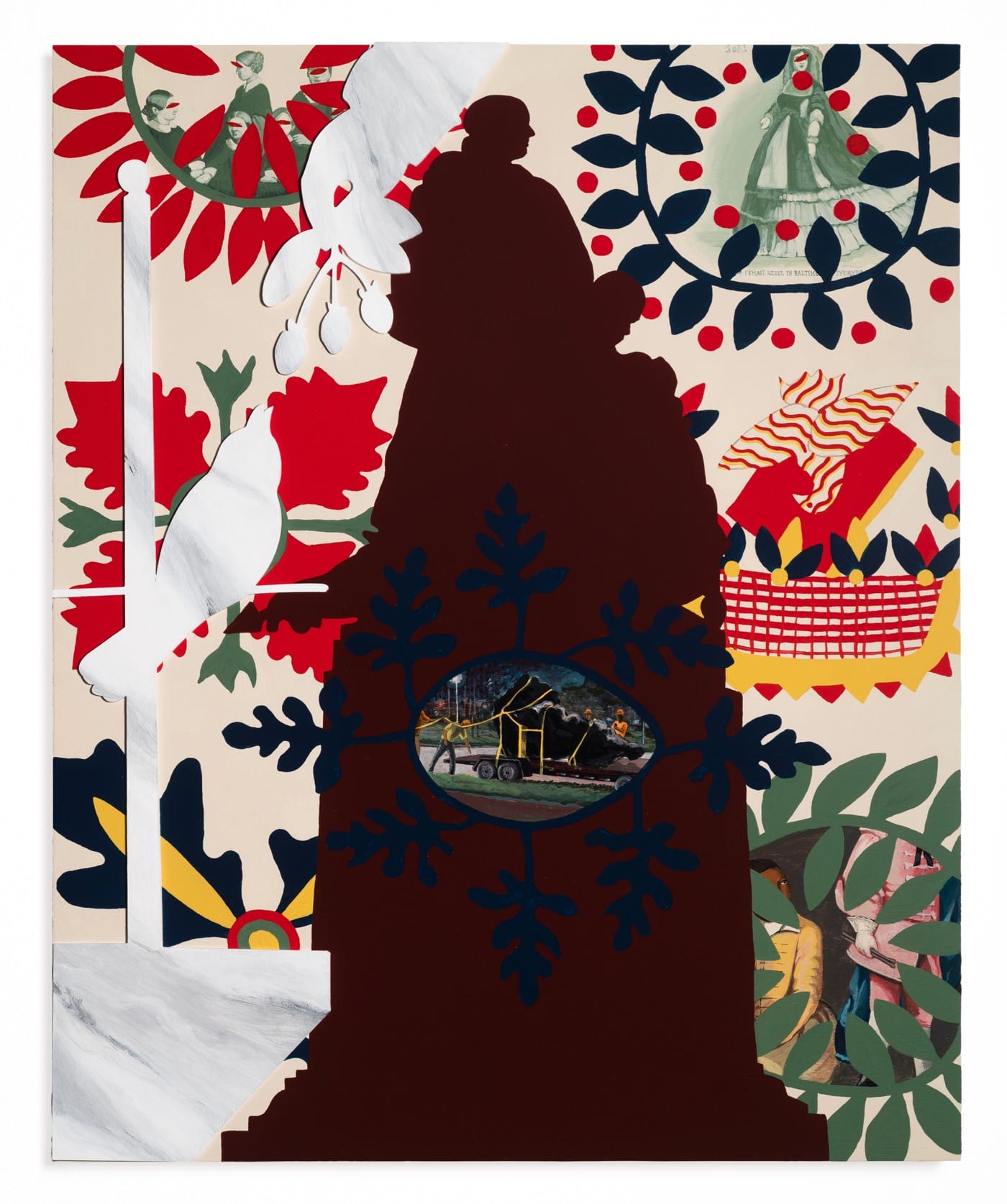 In the painting “Confederate Women’s Monument,” (2018) she renders part of Joshua Johnson’s 1805 painting “Edward and Sarah Rutter,” but as a laser-cut silhouette, and sticks it atop the surface of the painting. Adams then painted that shape to resemble locally mined marble which is ubiquitously used as stone steps in older row houses in Baltimore. Layered underneath this imagery on the canvas, a Baltimore album quilt pattern from 1851 plays host to several small vignettes, images embedded into circular areas of the pattern, as if a part of it. These pictures come from diverse sources such as Harper’s Weekly illustrations from 1961 depicting the Brown Veil Club, who sewed Confederate soldier uniforms in Baltimore, and “Charles Calvert and his slave,” a 1761 painting owned by the Baltimore Museum of Art; all are painted into the design, not unlike a Robert Rauschenberg collage.