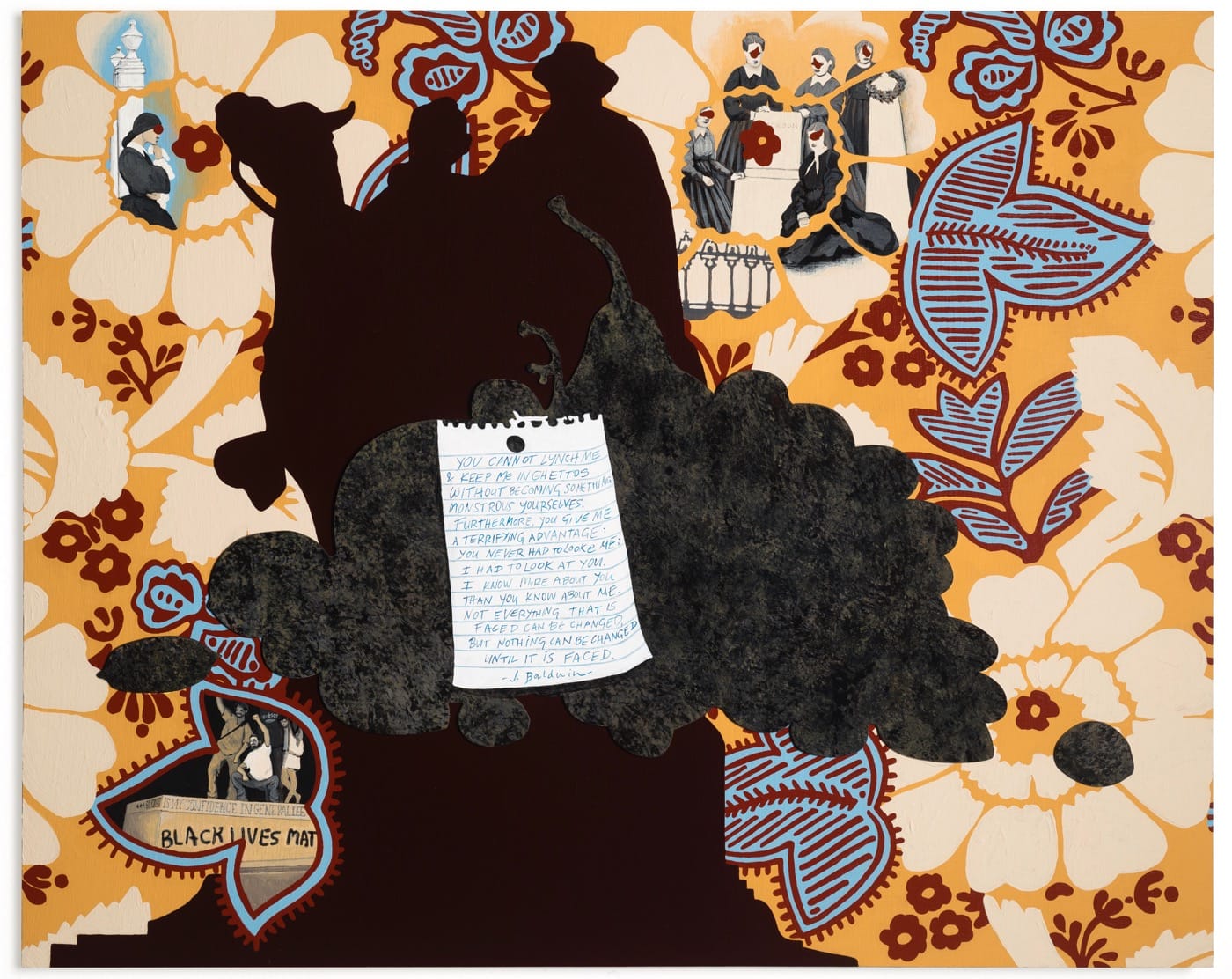 Across the gallery, a series of six medium-sized paintings balance out this exhibition. Each brims with a collage of seemingly unrelated images, where amiable design elements such as antique lace and quilt patterns act as a host structure for the artist’s research. Viewed as a group, the paintings present conflicted narratives around specific Confederate monuments: ahistorical myths of whiteness and support for white supremacy contrasted with images of art made by black artists in the 19th and 20th centuries.