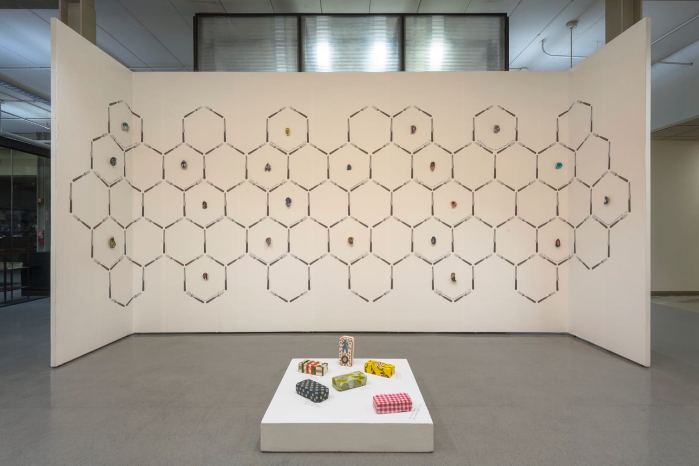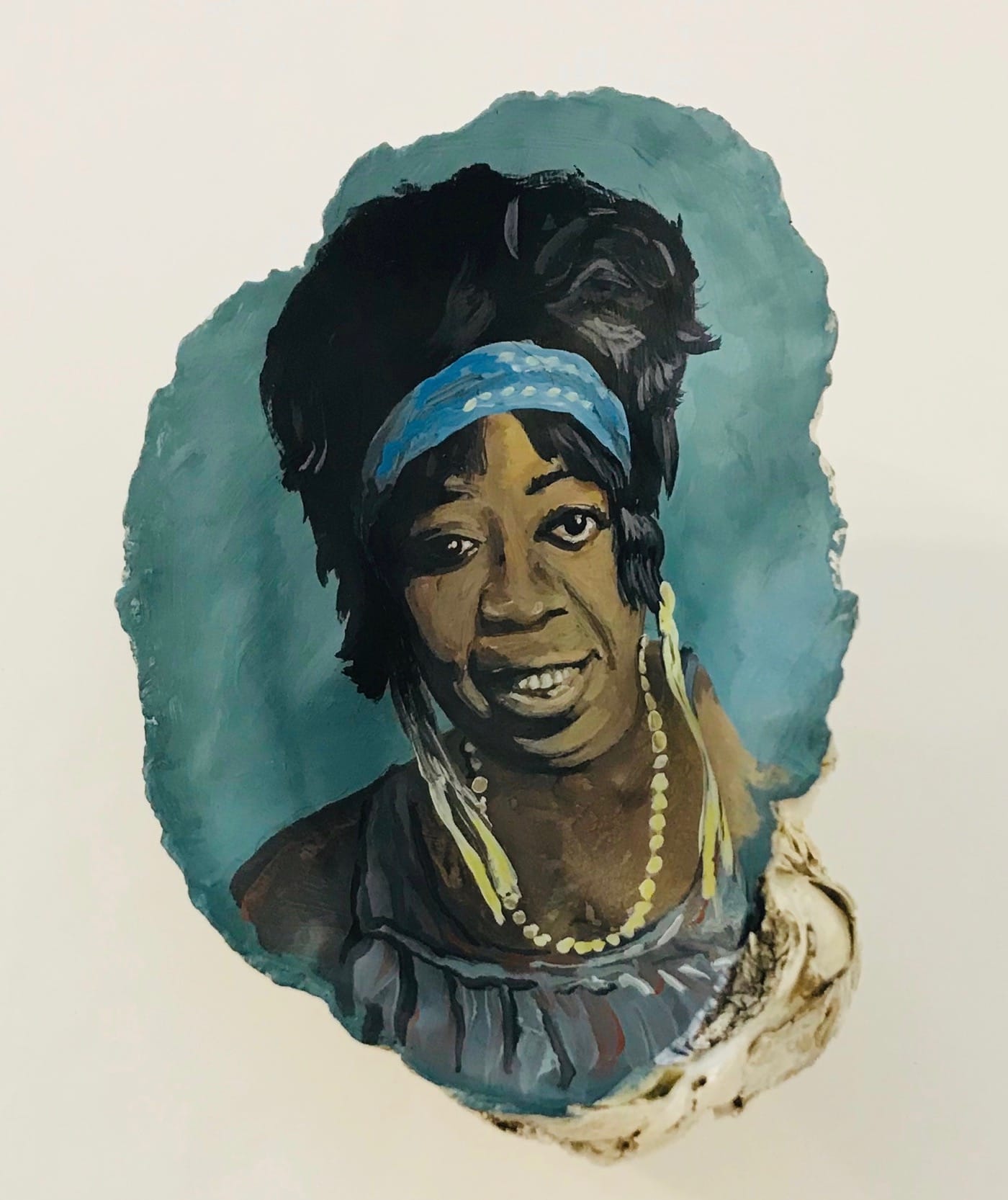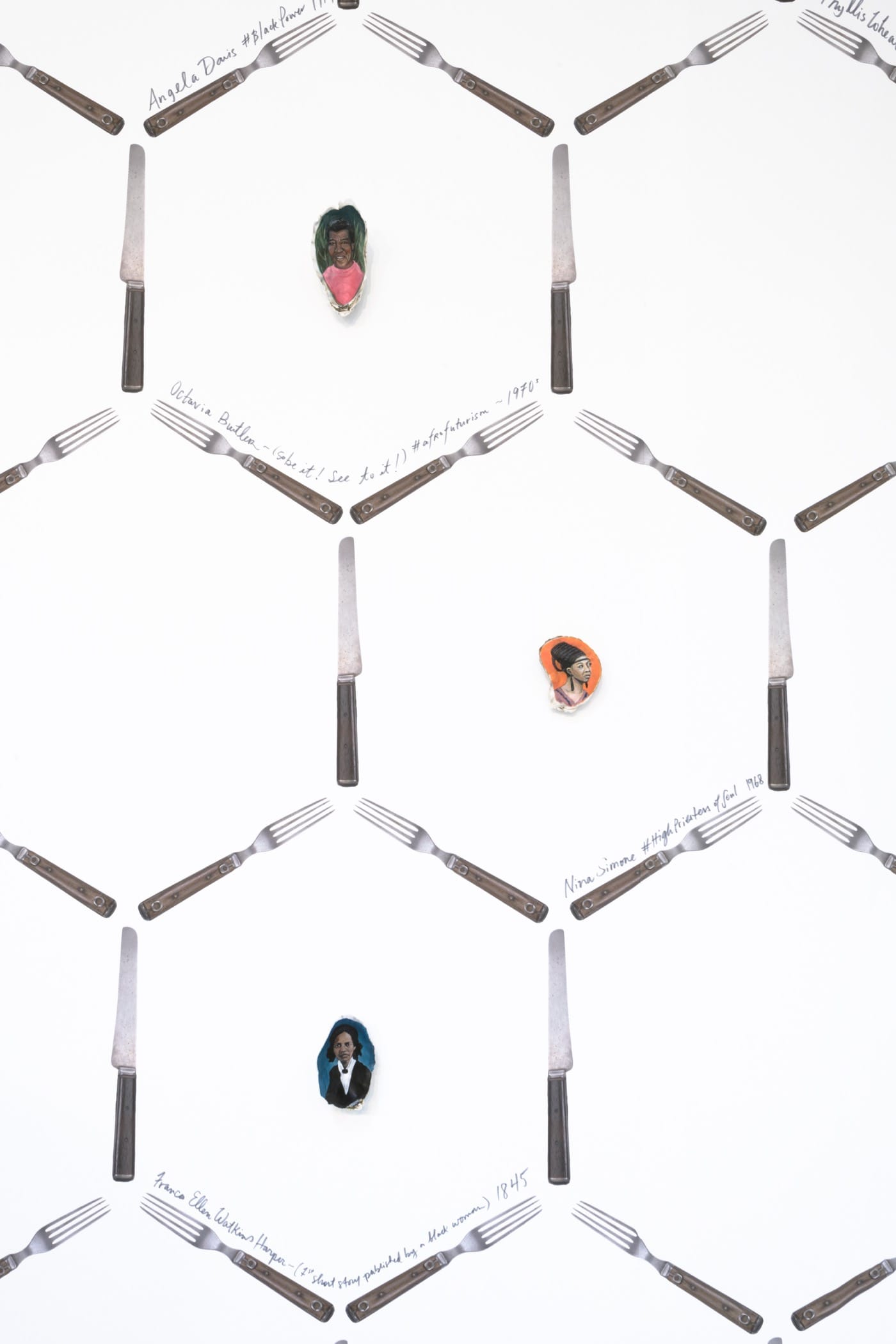 Using Tubman as a base for this installation, and the “Oyster knife” title (a quote from a 1928 Zora Neale Hurston essay) Adams constructs a web of black female excellence one portrait at a time. It’s an inclusive space where Ma Rainey, Shirley Chisholm, bell hooks, Bree Newsome, Josephine Baker, and many others come together to fill in the blanks that plague most history books and cultural canons. The background pattern is cohesive and visually compelling from a distance, and each shell is unique and warm, each portrait amended with added handwritten text, inviting motivated viewers to learn more.