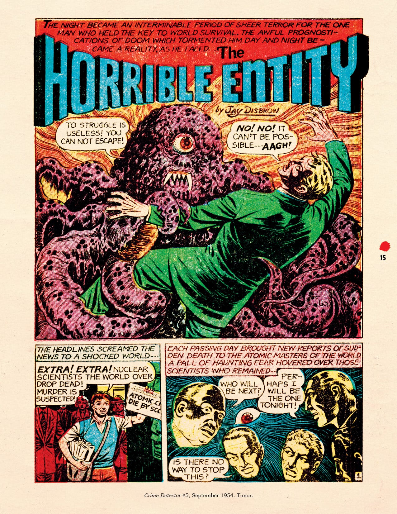 Panels dart inward at strange angles in “A Stony Death,” allowing for worming gutters and the provocative inclusion of an odd center panel. “The Ghoul of the North,” like every creature here, is enormous amid puny mortals. Giant fanged ogres from “the bowels of the earth” terrorize a novelist in “The Insider,” while a red-eyed specter towers over his prey in “The Unknown Presence.” Cinematic shadows blanket caverns and crime scenes, and action bursts out from under audacious type in title-page headers as graphic design and vintage movie posters figure into these pages as frequently as Alex Raymond’s Flash Gordon strips do. Disbrow’s action sequences are explosive, with hulking abominations reaching out from the back corner of a panel toward a helpless character in the foreground. All of your pre-Code goods are here: blood and guns and tentacles and stranglings and hell demons.
