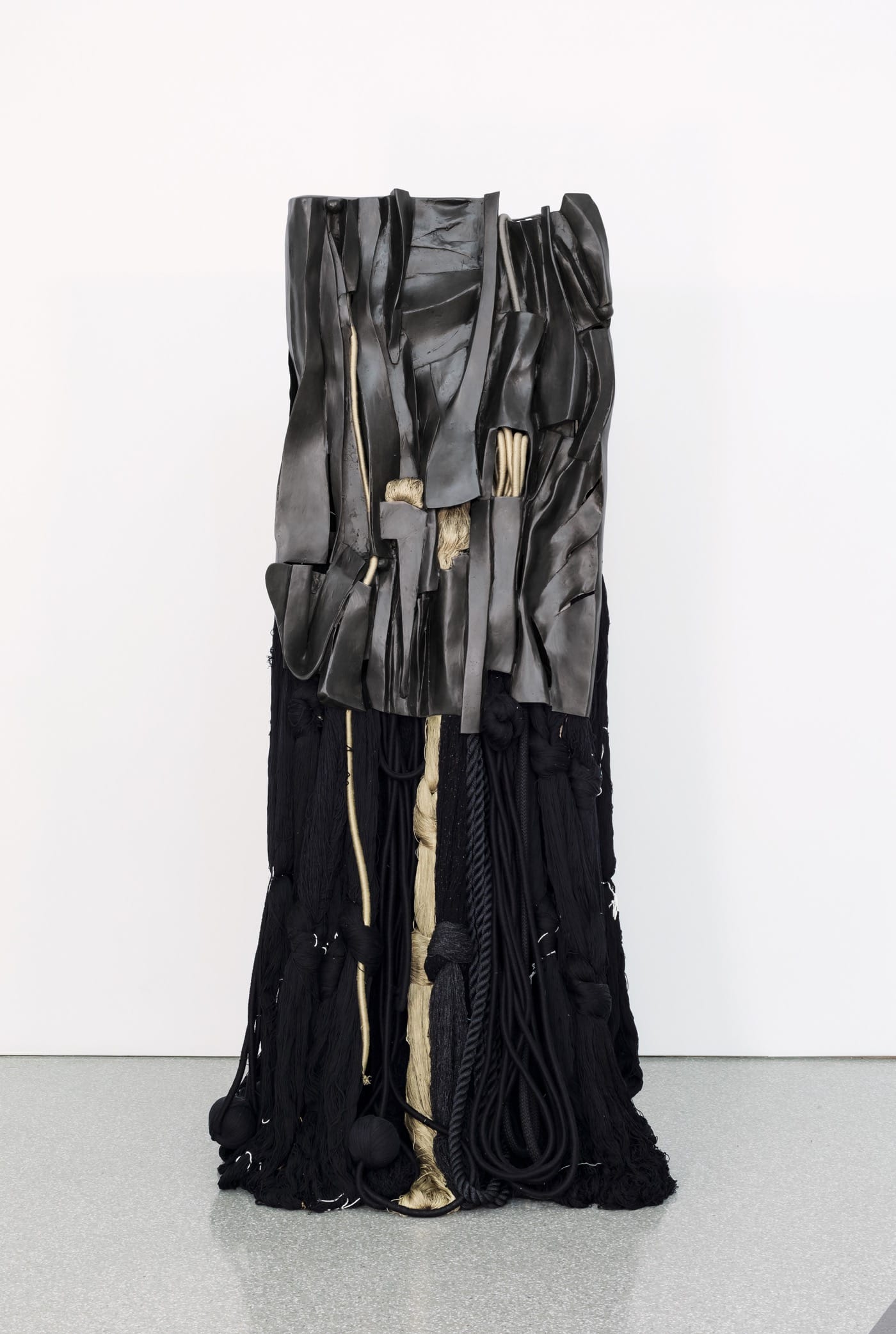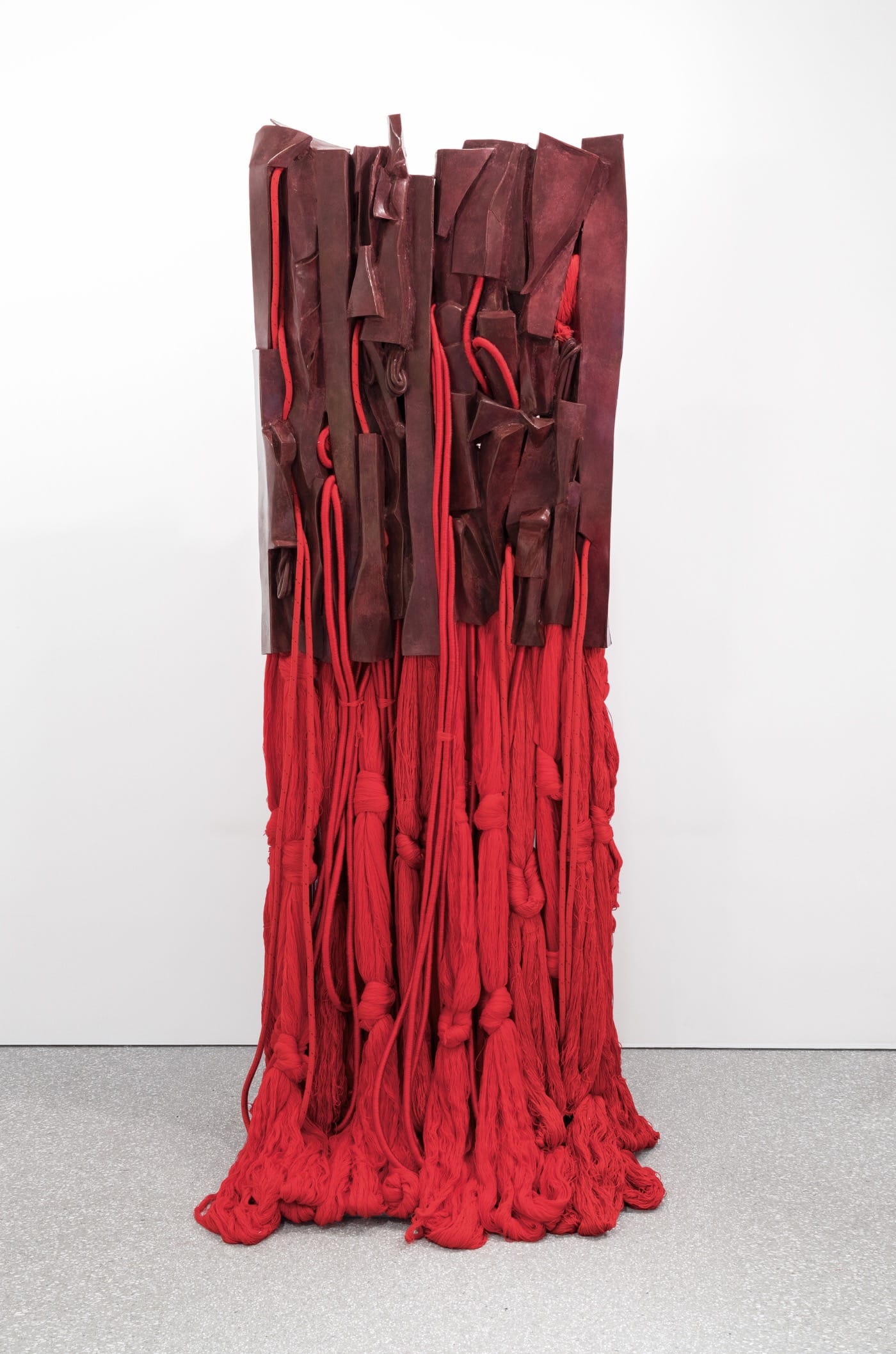 But more than the play-by-play of her history, the conversation with Basualdo is wonderful for the insights it relates regarding how Chase-Riboud has worked with the steles. She tends to describe her interaction with them in passive terms, claiming in essence that the work flows through her, in ways that leave her unaware of what is happening. In trying to understand the large gaps of time between the first of the Malcolm X series (she made four in 1969 and then abandoned them until 2003) Basualdo asks her: “What happens every time you go back to the Malcolms?” She replies, “I don’t know what happens! Every time I go back they come out the way they come out.” Yet, at same time she makes quite definitive decisions that are intended to solve problems, such as the design of the textile components, which she refers to as “skirts.” All done by hand, Chase-Riboud claims that they came out of a problem with representing legs. Then again, she imbues the skirts with agency: “They do this [convey a sense of movement] not because of something I do but because of what they are in themselves.
