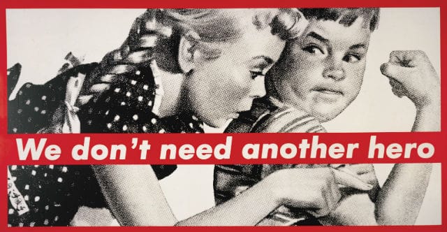 Kruger’s work is about how language and commercial imagery shape our identities. In block text stamped on top of pictures appropriated from newspapers and advertising, Kruger confronts us with our own insecurities: “I shop therefore I am,” one iconic piece reads. “Your body is a battleground,” another states.