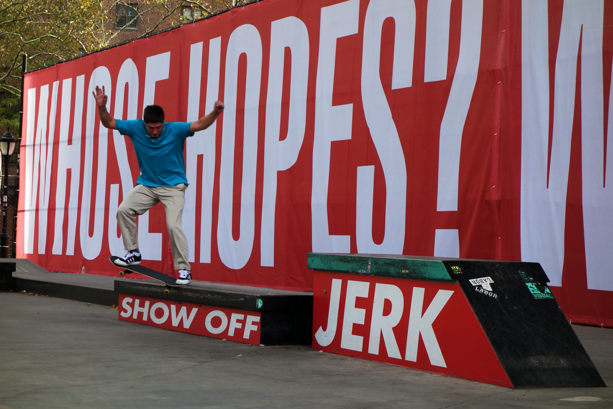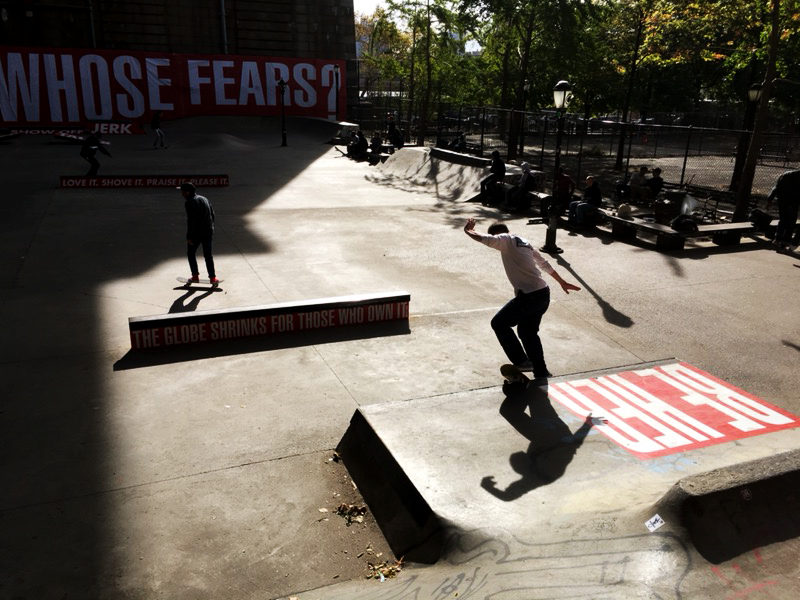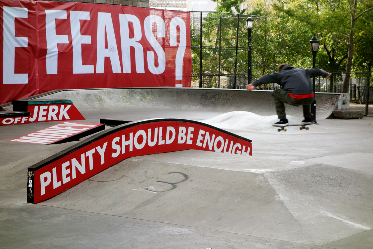 Kruger called all the parties involved “a ridiculous clusterfuck of totally uncool jokers,” and, considering Supreme’s deep roots in New York City’s skate scene, one can’t help but wonder if Coleman Skatepark was chosen as an extension of that criticism, or at least a commentary on her expropriation. Kruger’s irony might be lost on some, though. Several younger skaters I spoke with had never heard of Barbara Kruger, and initially thought the installation was sponsored by Supreme. “Who owns what?” indeed.
