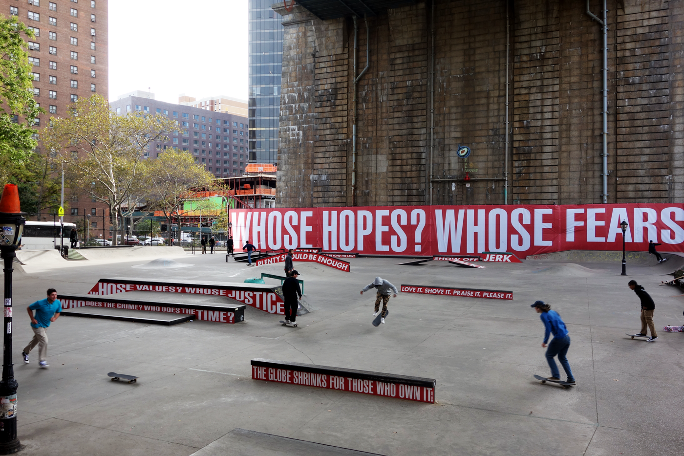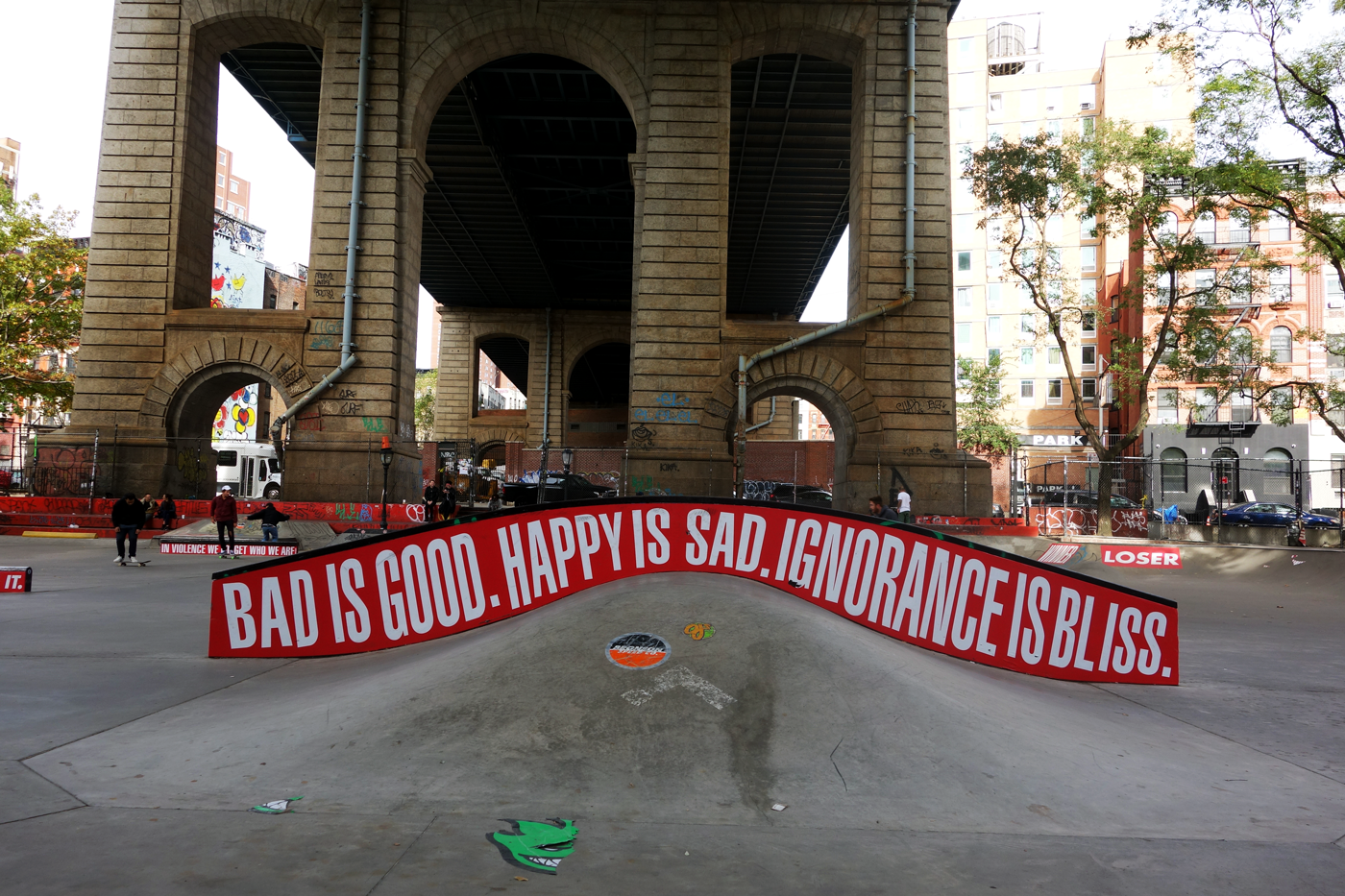 Beneath the blue underbelly of the Manhattan Bridge, Barbara Kruger’s red and white messages accost the eyes while gazing across LES Coleman Skatepark. The installation, “Untitled (Skate),” is one part of Kruger’s commission for Performa 17, the biennial of performance art happening around New York City through November 19. Along with a billboard, vinyl-wrapped school bus, pop-up shop, and set of MetroCards, the skatepark installation pushes Kruger’s tried-and-true (but verging on trite) work into the urban spaces she’s influenced most.