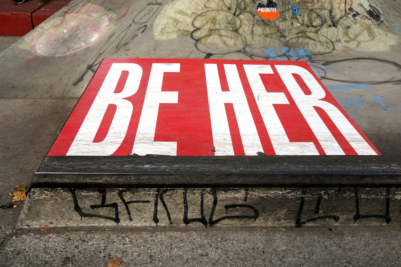 Kruger’s work can be slick in design and slippery in meaning, but here, overlaid on the steep transitions of the skatepark, the vinyl decals become slick and slippery to the touch too. Less than a week after they were installed, many of Kruger’s vinyls have been pulled off in favor of the grippier concrete beneath. But maybe the skaters’ response to Kruger’s installation isn’t only operational, but a reaction to her messages too. Her mandate to “BE HERE NOW” has been truncated to the subversive “BE HER” as if the skaters are balking at being told to live in the moment by a conceptual collagist. There’s a meditative mindlessness inherent in the motion of skating; it’s a physical art enacted through fast-twitch muscle memory over mere milliseconds, and Kruger’s platitudes can seem to interrupt that experience.