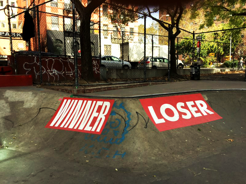 When I visited the park this past Saturday, I was there as both spectator and skater, evaluating the installation both visually and physically. I imagine that, through the telephoto lens of a tourist, (and there were nearly as many photographers present on Saturday morning as skaters), the installation can seem mesmerizing. Skaters, mostly male and juvenile, flew and fell in front of Kruger’s banners, creating a kind of corporeal poetry. Someone took off from a ramp emblazoned with “WINNER” and gracefully landed on another labeled “LOSER,” and the arbitrarily binary bounds of social competition came crashing into mind. But from the perspective of the skaters — the unwitting participants of this project — Kruger’s installation might look nice, but isn’t very functional.