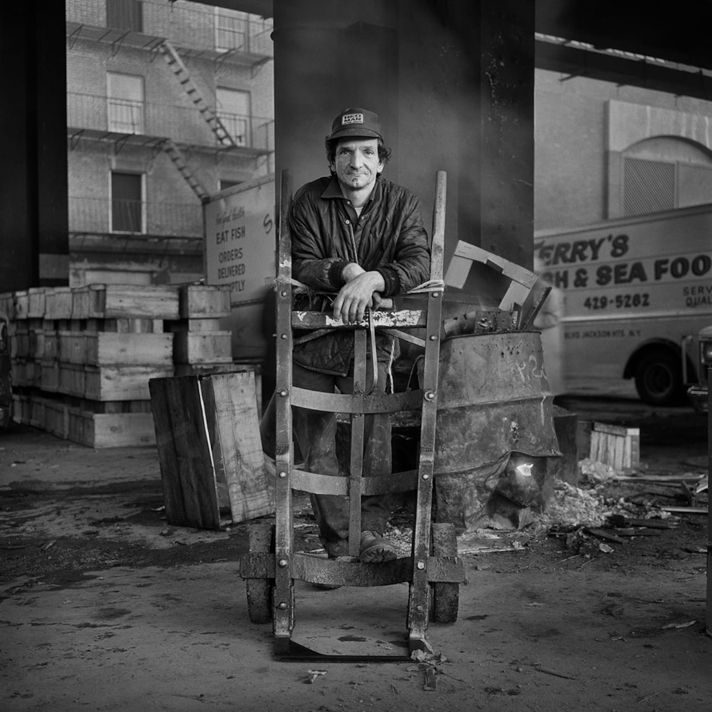 Mensch’s vision of New York appears romantic, but she knows that the people who built it are under constant threat of being swept aside by changes in the city. The second wall of the exhibition shows three photographs of workers from her waterfront project — presented in her books South Street (2009) and A Falling-Off Place (2023) — during which she focused on the Fulton Fish Market, the largest seafood hub in North America, as the city investigated its ties to organized crime in the 1980s and eventually moved it to the Bronx. Beside these portraits are photographs of structures in New York that have been transformed or demolished since she photographed them, including a movie theater in Spanish Harlem with a marquee that’s missing several letters but once said “The Party Never Stops.”