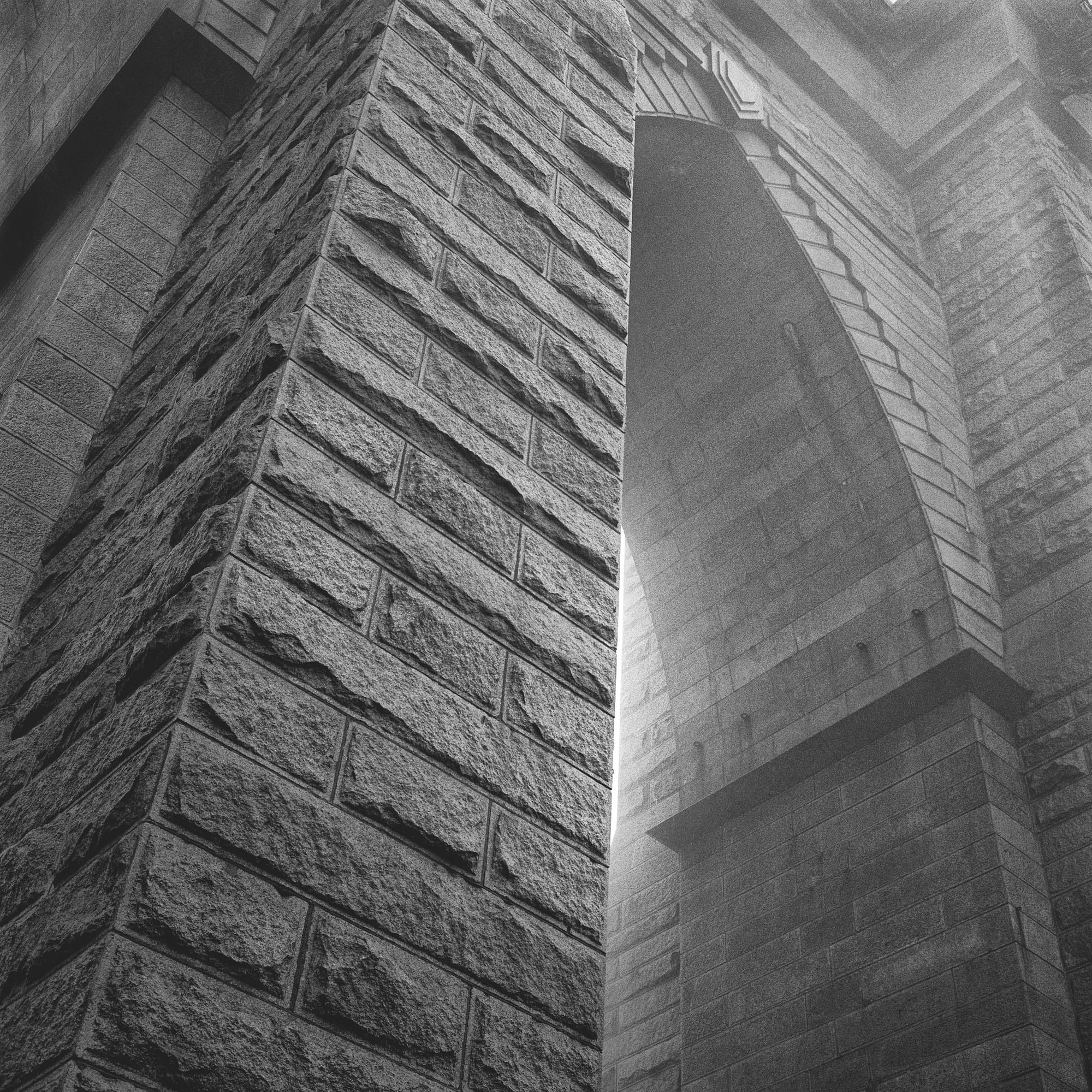 Roebling’s relentless drive resonates with Mensch, who lets her intuitions guide her. Her photos reflect the deeply held ideas of the bridge’s creator, such as his belief that every human endeavor is spiritual. A quintessential example in the show is her photo of the bridge’s New York tower. The pointed arch mimics the Gothic church Roebling attended as a child; a sliver of light coming through creates an almost otherworldly atmosphere. But after reading Mensch’s accompanying text, which describes the human costs of actualizing Roebling’s vision, one cannot help but imagine the tower’s foundation, where immigrants of German, Italian, and Irish descent toiled below the water’s surface, some of whom died from decompression illness. Mensch’s photo speaks to the interconnectedness of life and death.