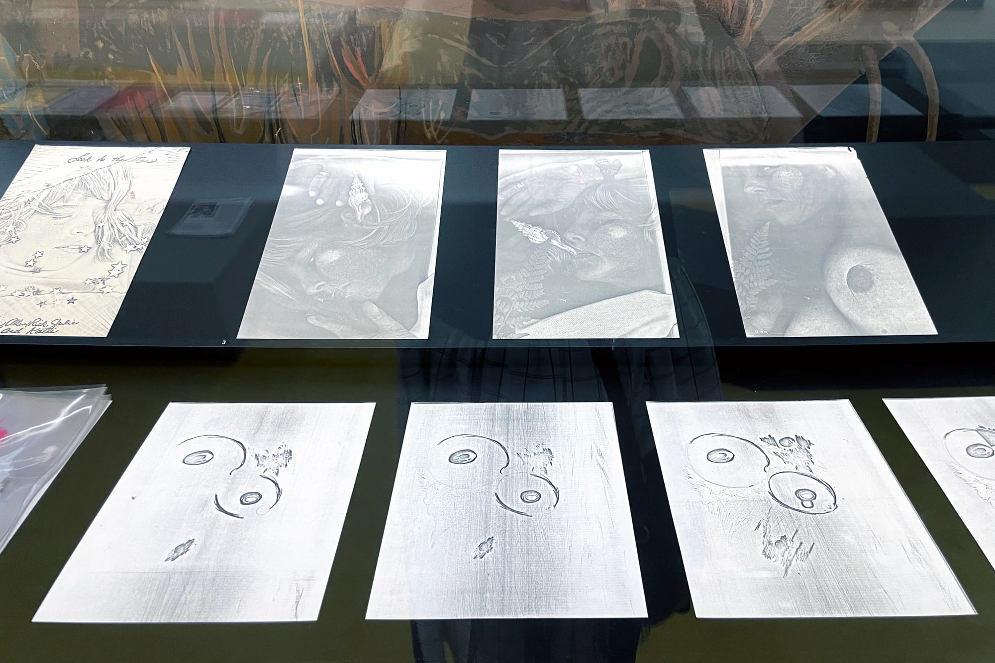The works in which Smith’s body appears are particularly exciting, as they signal her future in performance. The three prints that make up “Self Portraits” (1966–67) show her hands and face smashed against the glass alongside a seashell and a fern, evoking a sense of drowning.