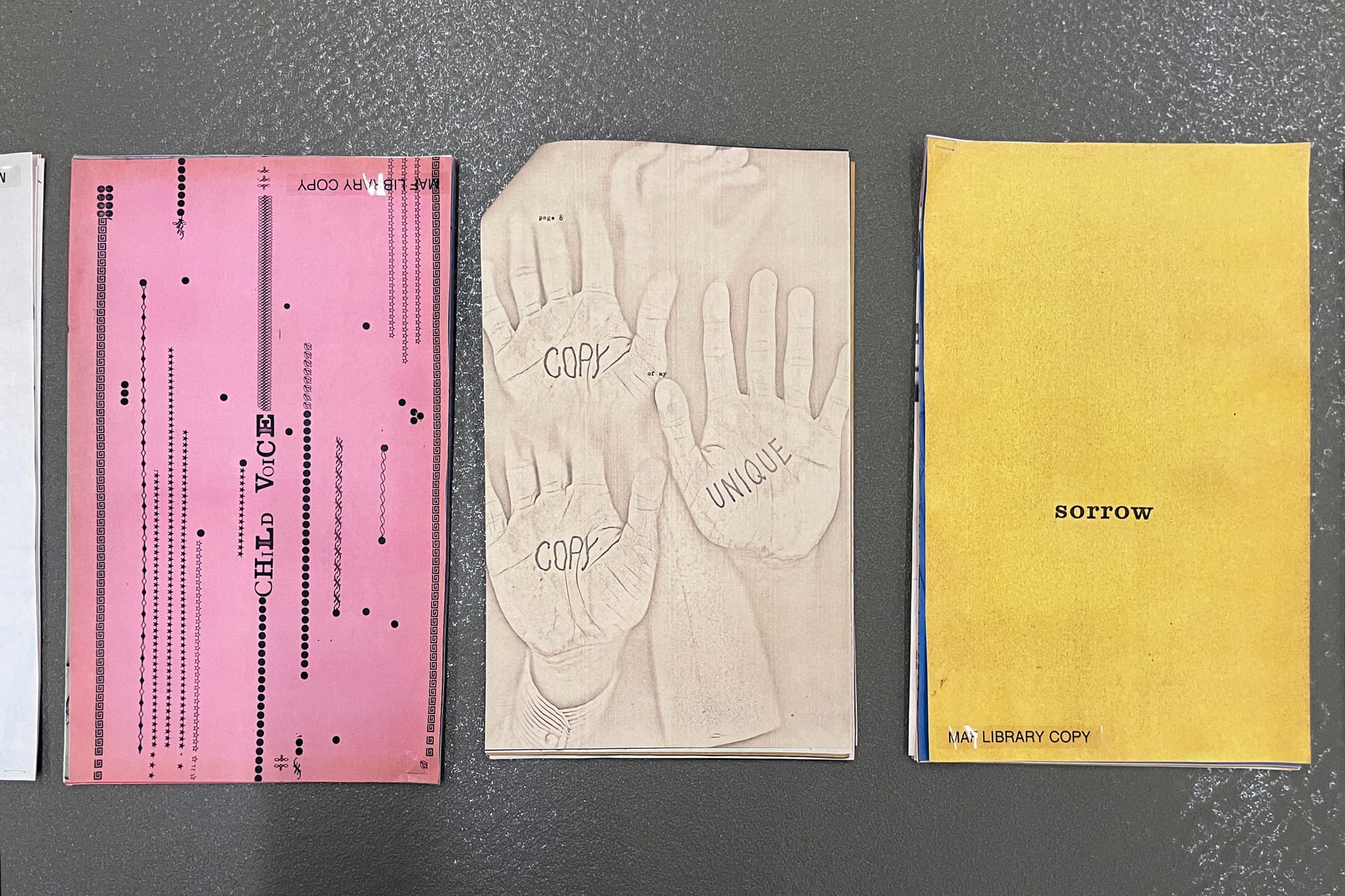 A portion of these works is currently on display in Barbara T. Smith: Xerox 914 at the Marciano Art Foundation’s library, which showcases Smith’s thorough experiments with Xerox’s capabilities. She scanned photographs, toys, and her own body to make a varied set of poetry zines and prints. She treated the machine like a lithograph, often running prints through the copier multiple times to continuously add to its composition. This was the process through which she created four hands on a single page within the publication “In Self Defense” (1966–67). In a meta-gesture, the palms read “copy” and “unique.”