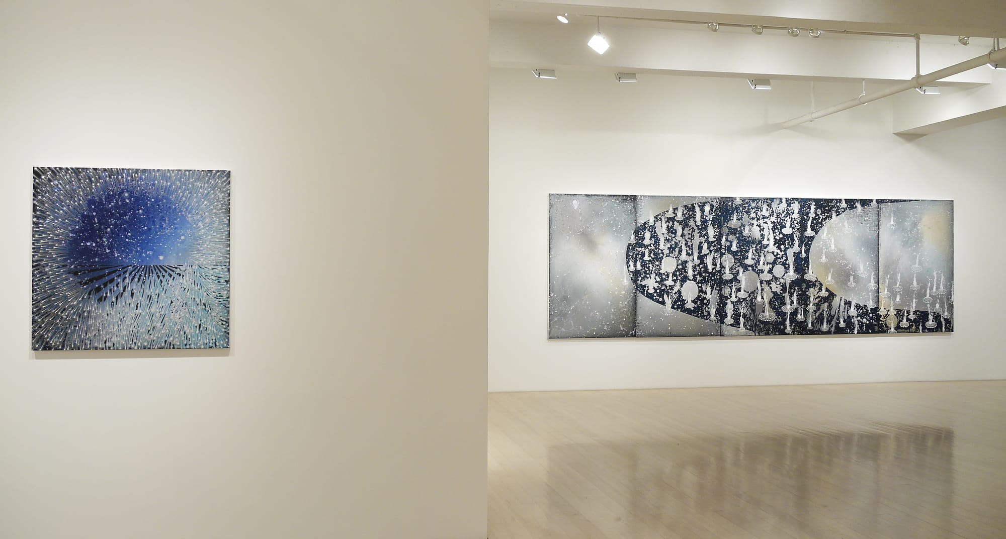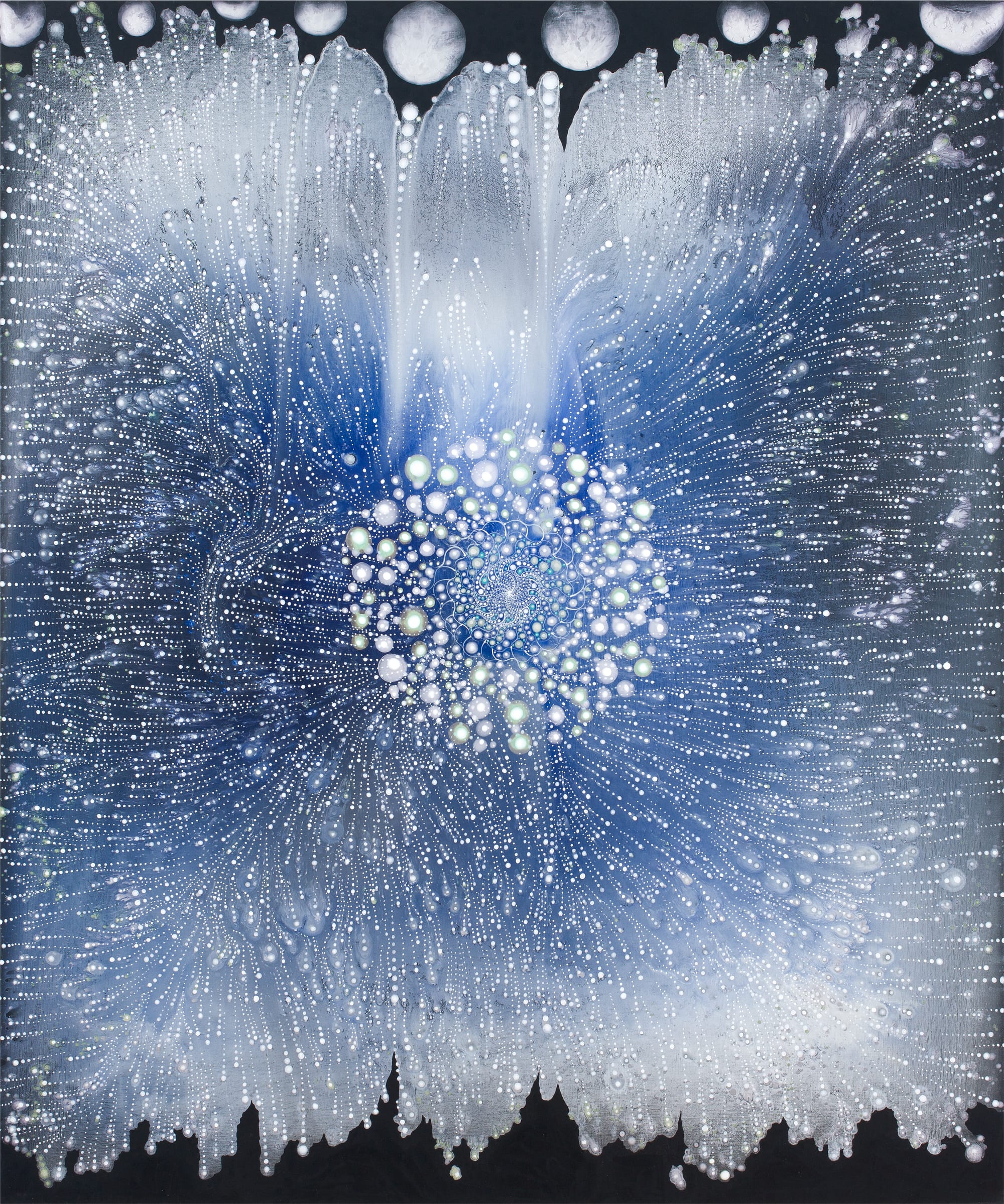 In other paintings, such as “The Edge” (2018), she evokes meteor showers. What gives Takenaga’s work a deeper resonance than one encounters in much contemporary abstraction is her allusion to of a world under constant pressure and in a state of relentless change. What also strikes me is the work’s overt visual appeal. A field full of beaded lines going in multiple directions simultaneously is visually sensual. Meticulousness and pleasure meet in these marks. It is clear the artist is attentive to each shift in direction, as none of the rhythmic lines repeat themselves. The dance between order and individuation is precise and exquisite. Looking at the vastness of space that “The Edge” embraces conveys the possibility of solace in this time of terror and disruption.