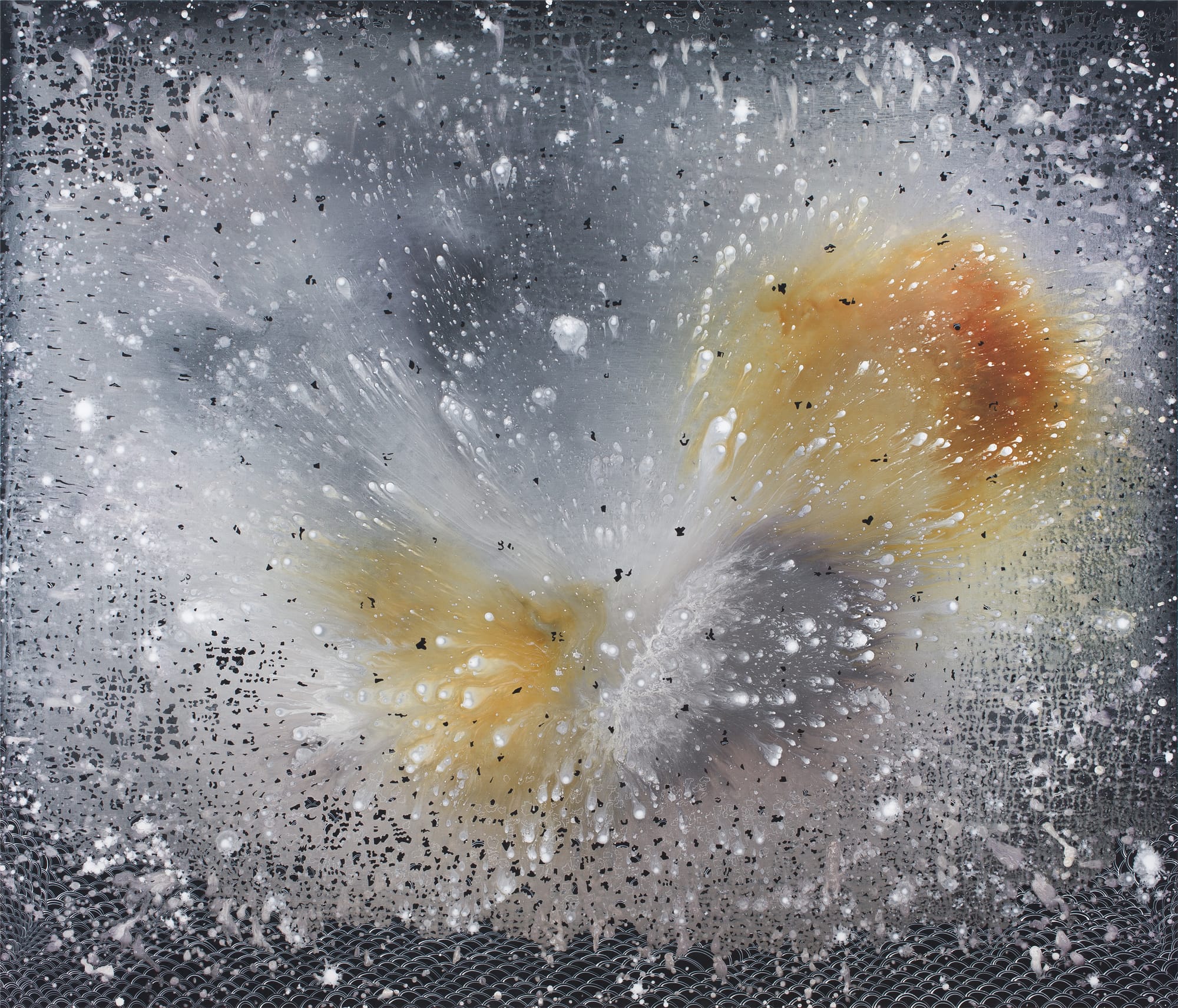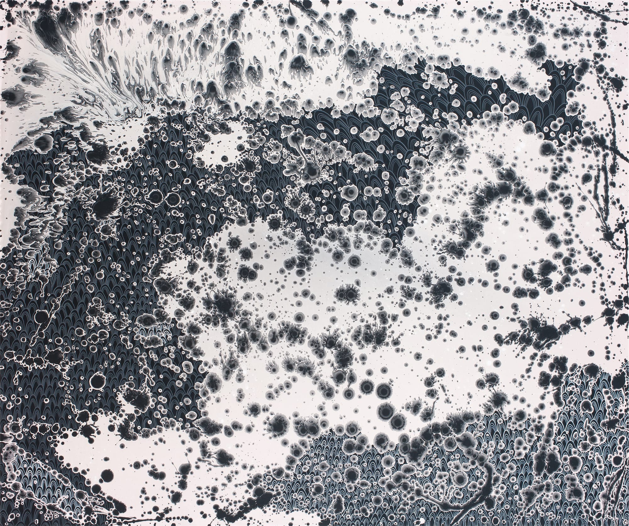 Since the beginning of this century, painter Barbara Takenaga has slowly expanded her project, moving from a set structure, which she explored, to an open-ended process in which meticulous control and the surrender of power interact with one another, with unexpected results. While she was doing this, she was also expanding her vocabulary to include Japanese symbols, such as a pattern of fish-scale lines, into her work. Another image resembles a geyser of steam rising into the air, its base framed by concentric rings punctuated by dots.