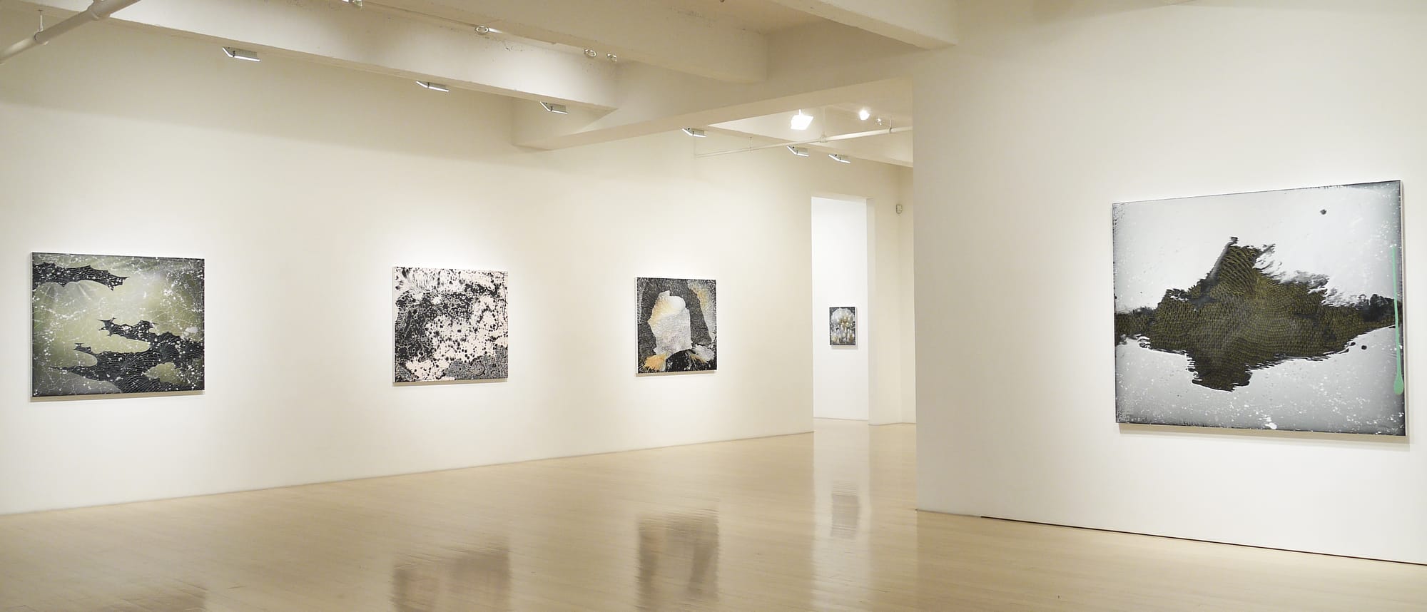 This means that Takenaga has become more focused on composition. Her recurring subject is a view of nature that is simultaneously real and imagined. In “Serrulata” (2018), the artist layers multiple vocabularies and processes — patterns, pours, splotches, and drips — without trying to order them into an all-over composition. The palette is composed of contrasts — dark blues, blacks and grays — that further compress the layered space, in which different kinds of marks are pressed together. Instead of being soothed by repetition, we are given disruption. “Serrulata,” the painting’s title, is another name for the Japanese cherry tree, which is central to the spring cherry blossom festival. The pink flowers blossom for about two weeks before falling; the transience of their beauty is reminder of the life’s brevity.