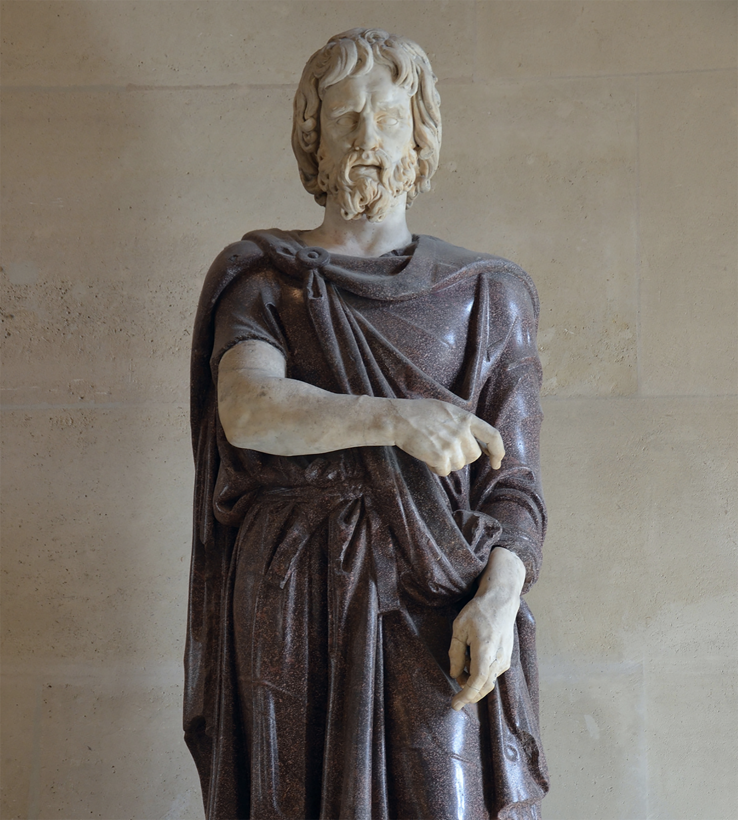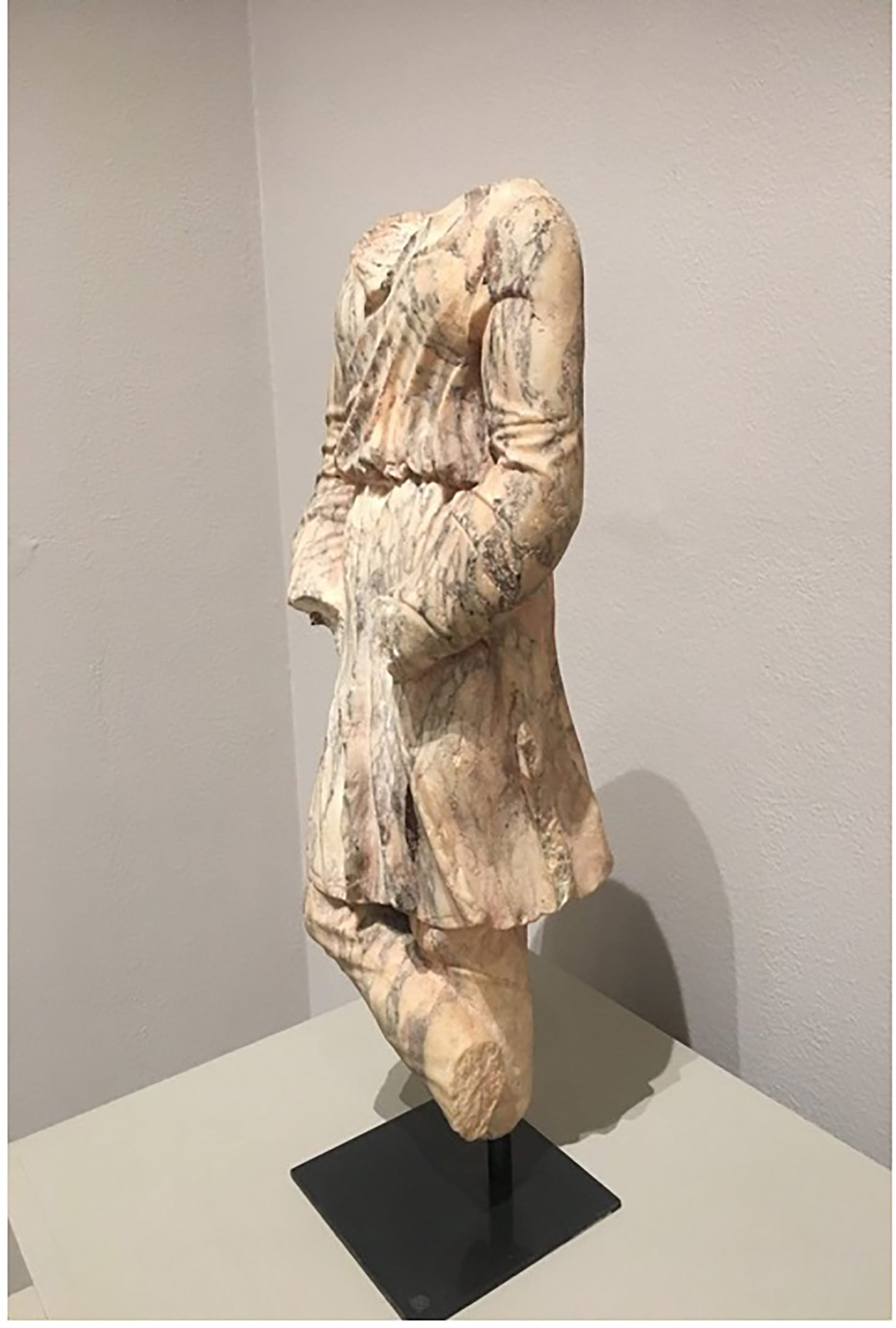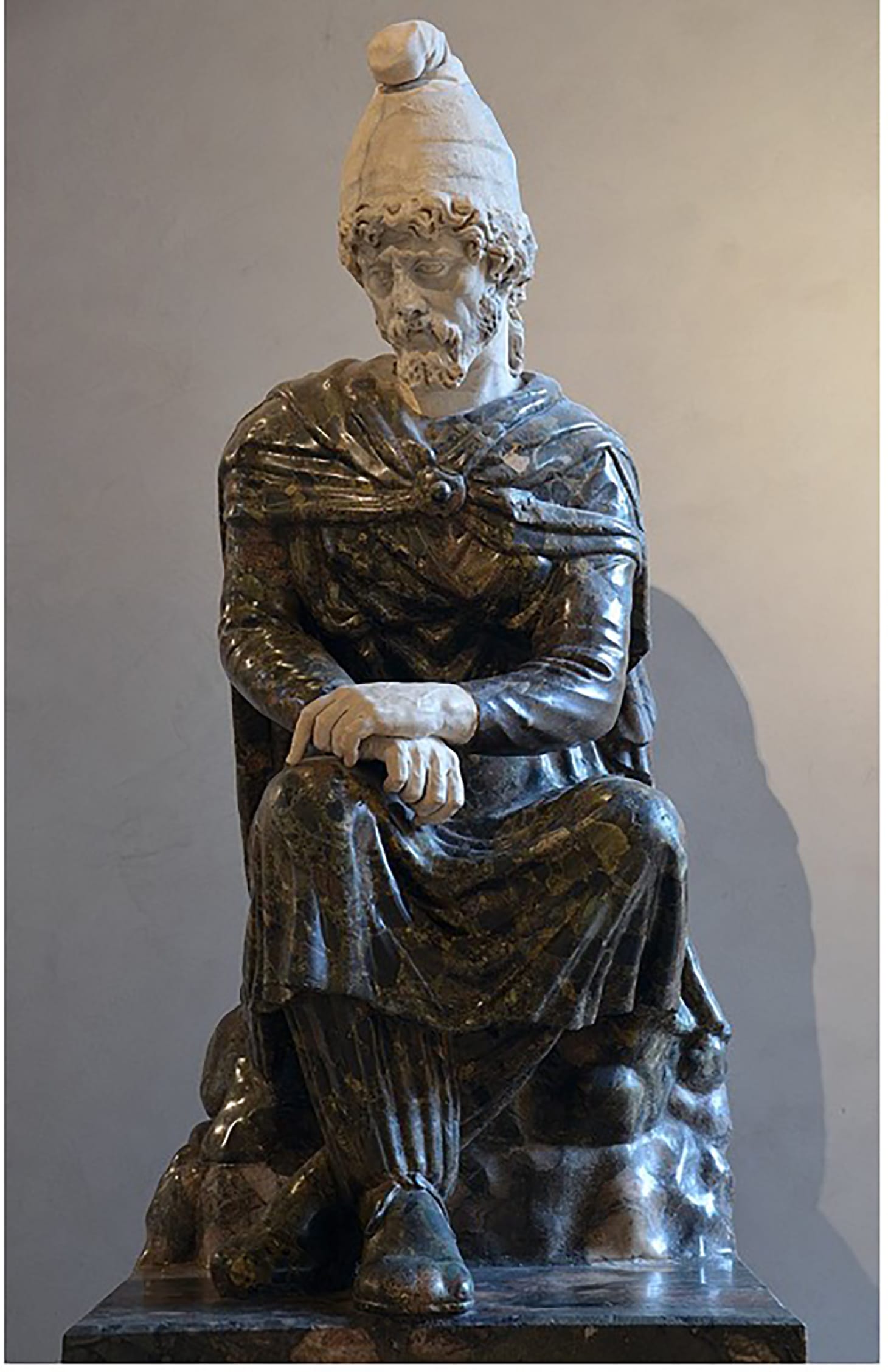 It is key to remember that polychromy—simply the use of multiple colors in artwork—is not limited to paint alone. Although sculptors applied variously colored hues, attached metal accents in bronze, and added bone or glass inlay to marble, all providing colorful notes, the marble itself could be a pivotal source of polychromy. As a small statue on display at the Museum of Fine Arts in Boston reminds us, naturally occurring multicolored marbles from all over the Mediterranean were often used by Roman sculptors to give statues patterns and color. The use of such multicolored marbles could lend life-like animation to the statues in ways that go far beyond painted techniques. This small statuette is one of many in which Roman sculptors not only carved non-Roman clothing but selected colored polychrome marbles in order to accentuate the difference between Romans and non-Romans.