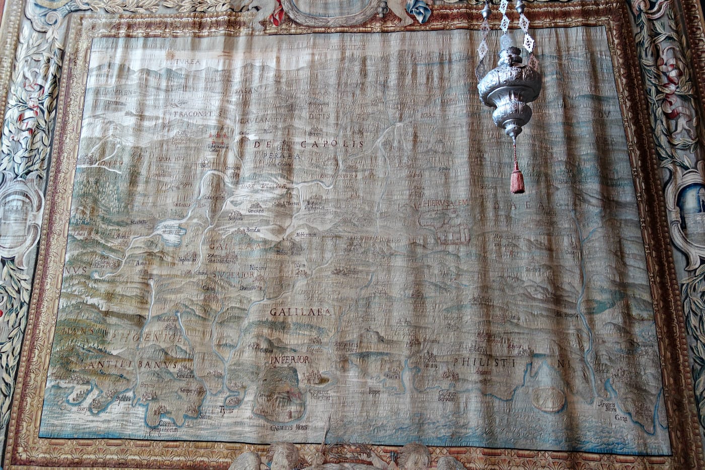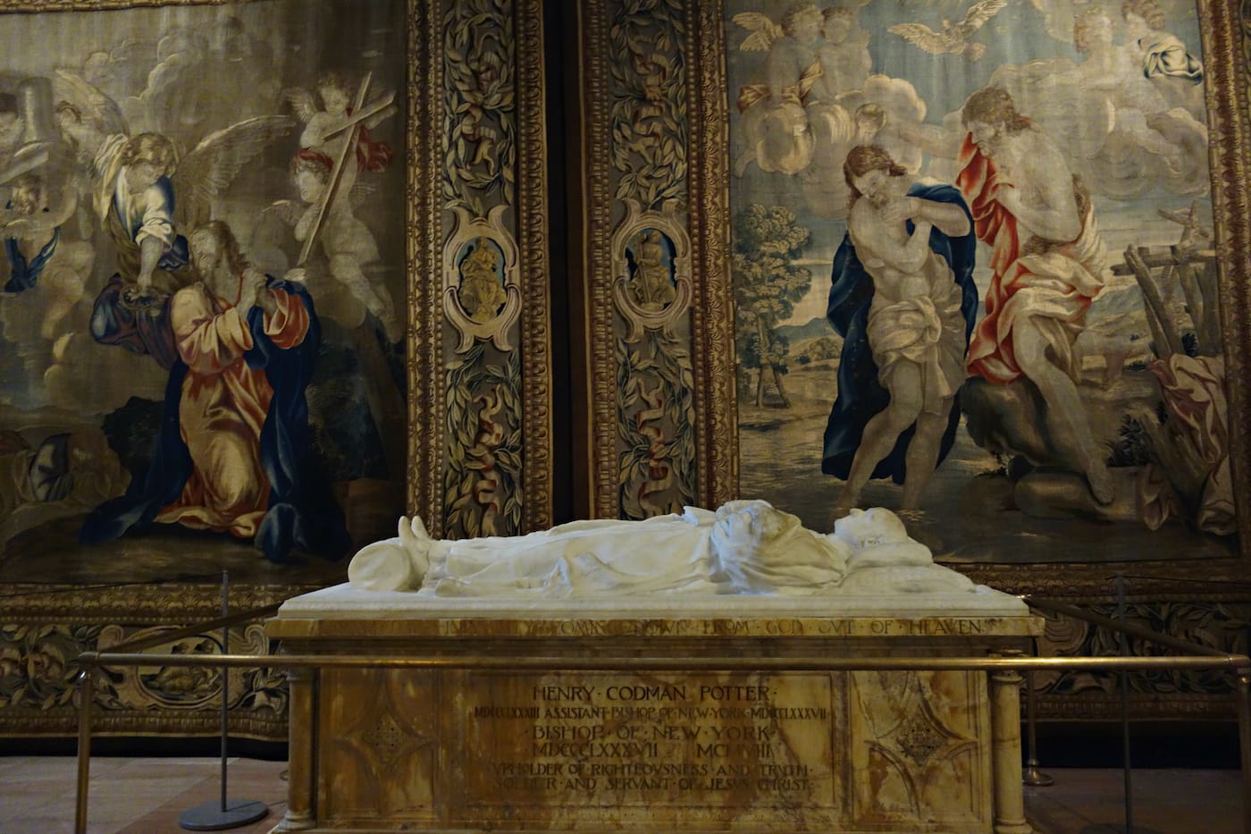 The tapestries were not designed to be static objects, but rather art that was lived with, wherever their owner may be. A timeline of their travels from 1650 to the present included in the exhibition has stops at St. Peter’s Basilica in Rome where Cardinal Barberini regularly loaned the tapestries, and the palatial Palazzo Barberini alle Quattro Fontane in Rome, which was the headquarters of the family. Just before construction on the Cathedral of St. John the Divine started in 1892, the donation of the tapestries was arranged by the Reverand Morgan Dix and Bishop Henry Codman Potter, whose tomb effigy is appropriately situated in front of the exhibited tapestries in the chapel. The series had been acquired by Elizabeth U. Coles through collector Charles M. Ffoulke, who had bought the tapestries from the Princess Barberini in 1889.