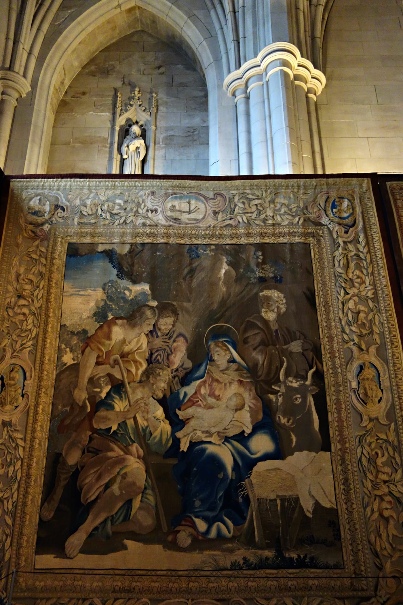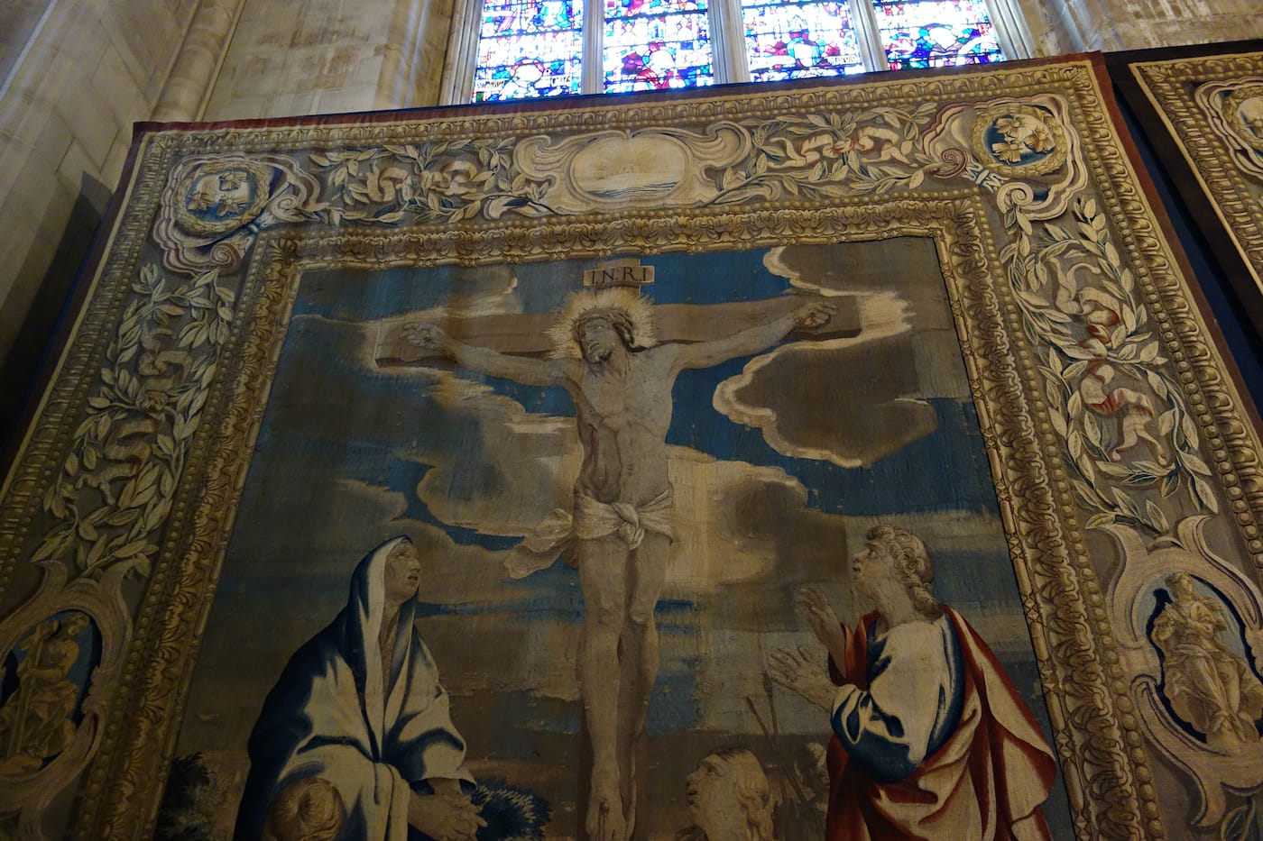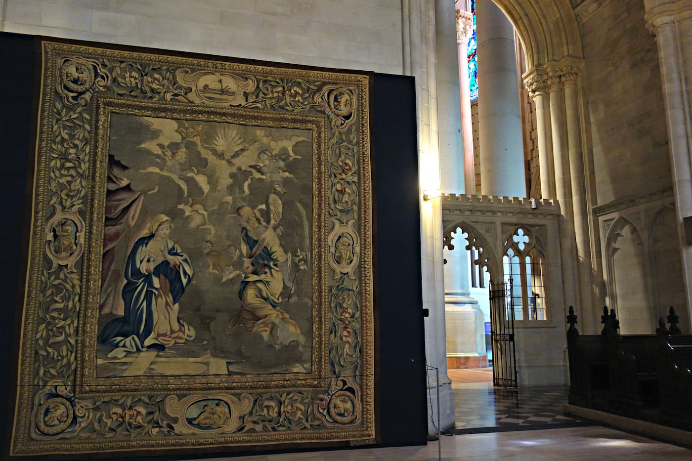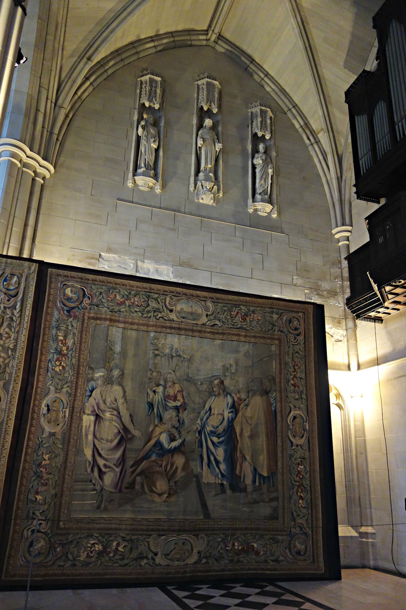 On view are 10 of the 12 Life of Christ monumental tapestries, chronicling the birth, life, and death of Jesus Christ in newly clean wool and silk. The two that are not — the “Last Supper” and “Resurrection” — received the most damage in the five-alarm fire that broke out in the church on December 18, 2001. The New York Times reported on December 19 that the two were “retrieved only after they had been thoroughly soaked by the hoses,” and what “remained by midafternoon was a soggy heap of charred material that was deposited on a table in the middle of the cathedral.” Soot, dirt, and centuries of gravity’s pull also necessitated the conservation of the other tapestries.
