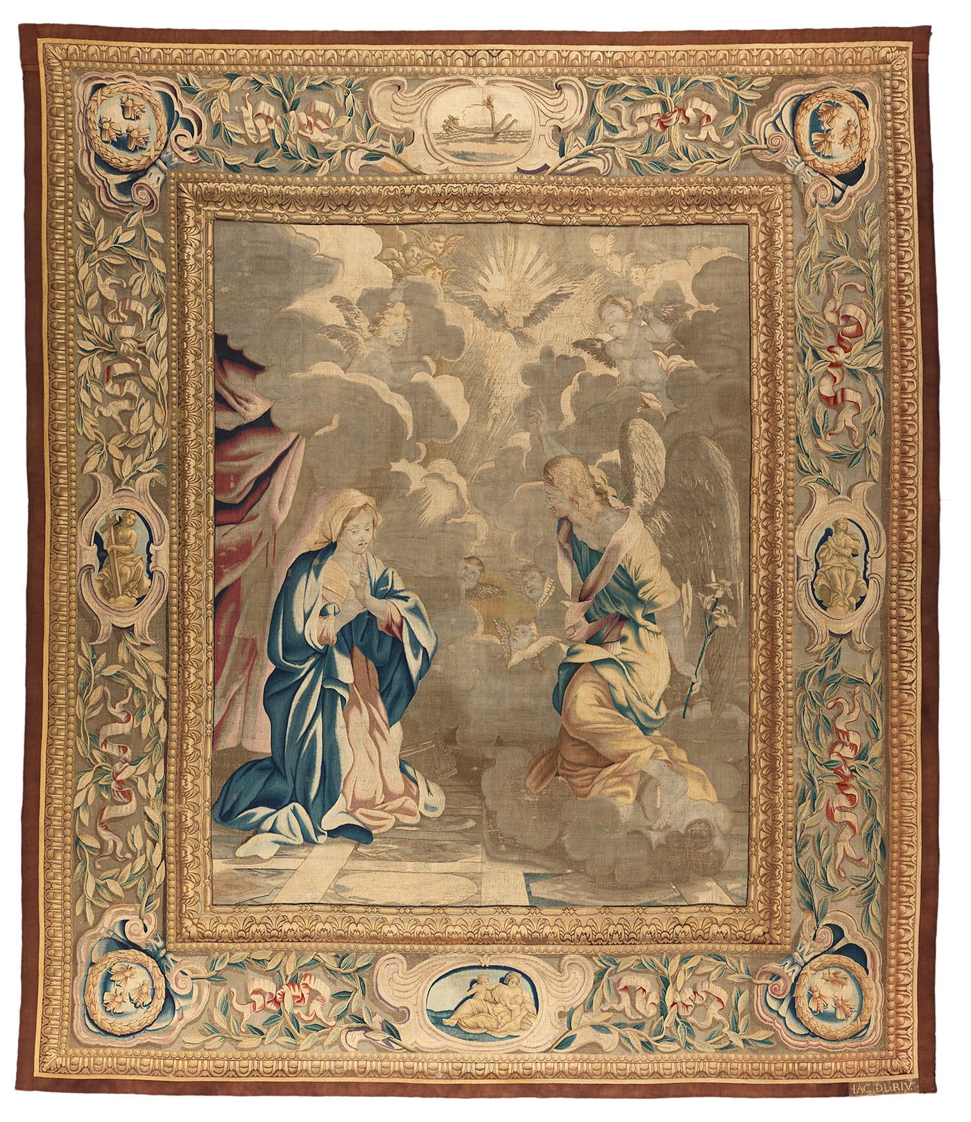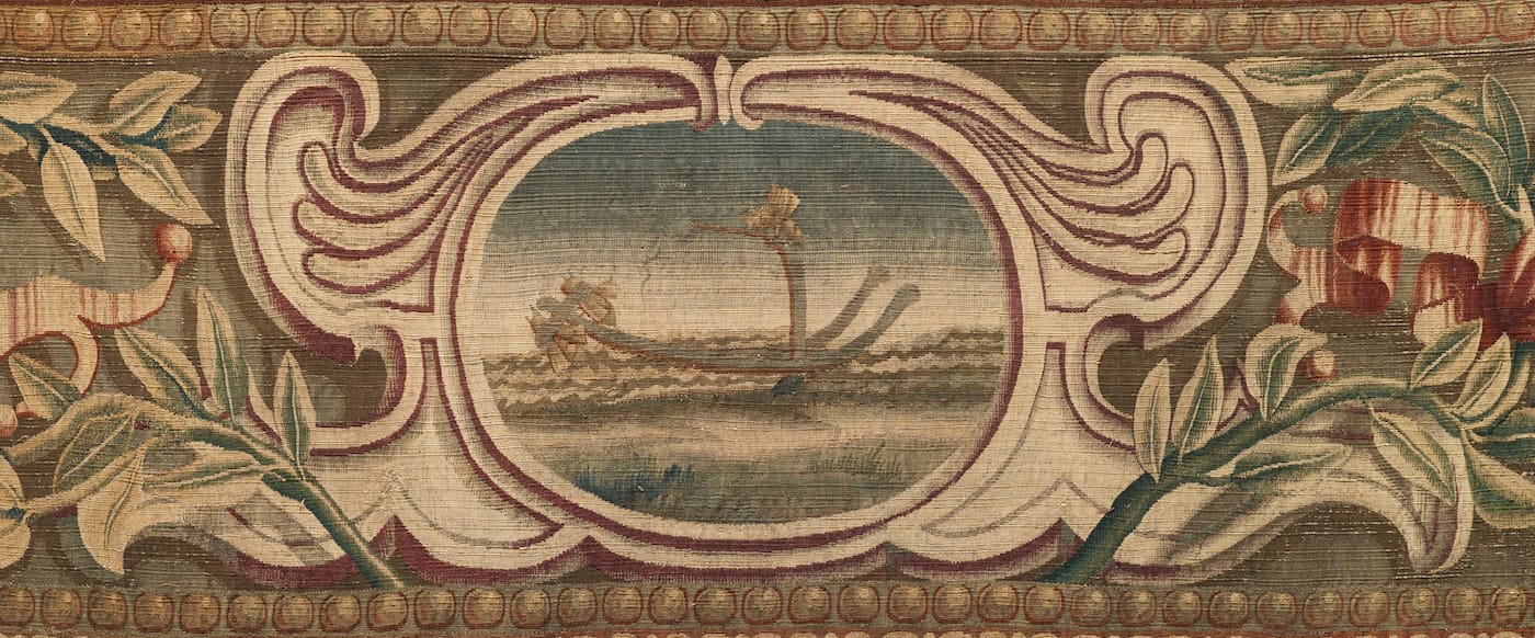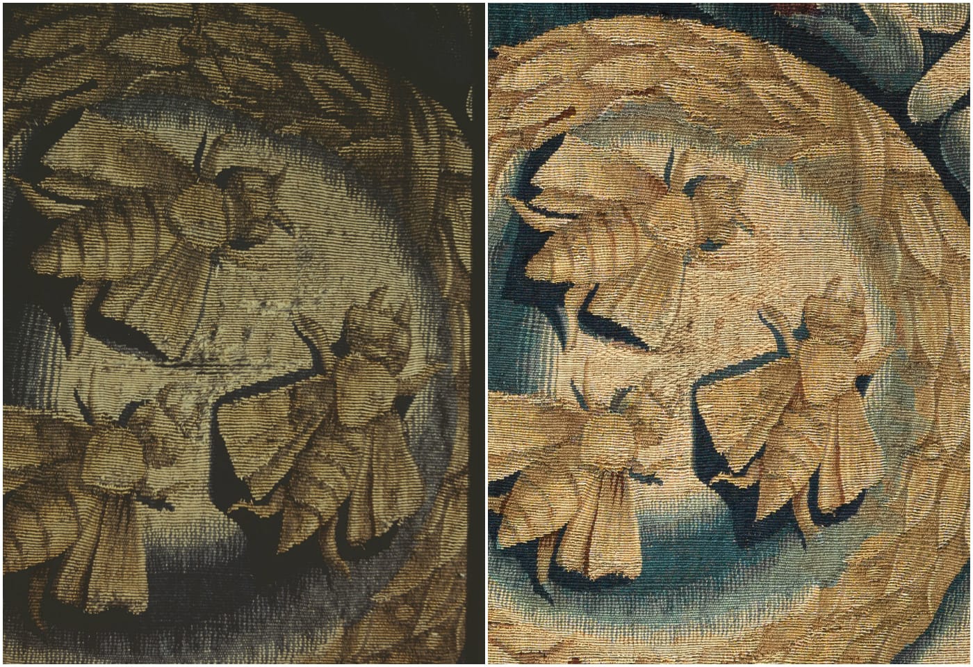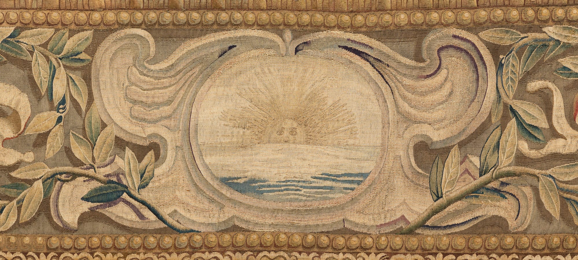This fall’s trip to the West Coast is only the latest stop in the journey of the Barberini tapestries. Initially commissioned by Cardinal Francesco Barberini, the nephew of Pope Urban VIII, from the baroque artist Romanelli, they were woven in Barberini’s own tapestry workshop. The 17th-century weaver’s marks are still present at the bottom of the tapestries. Each is additionally adorned with three bees against a blue background, the Barberini coat of arms (a symbol of industry and success that has a curious iteration on some of the borders, with bees working a plow).