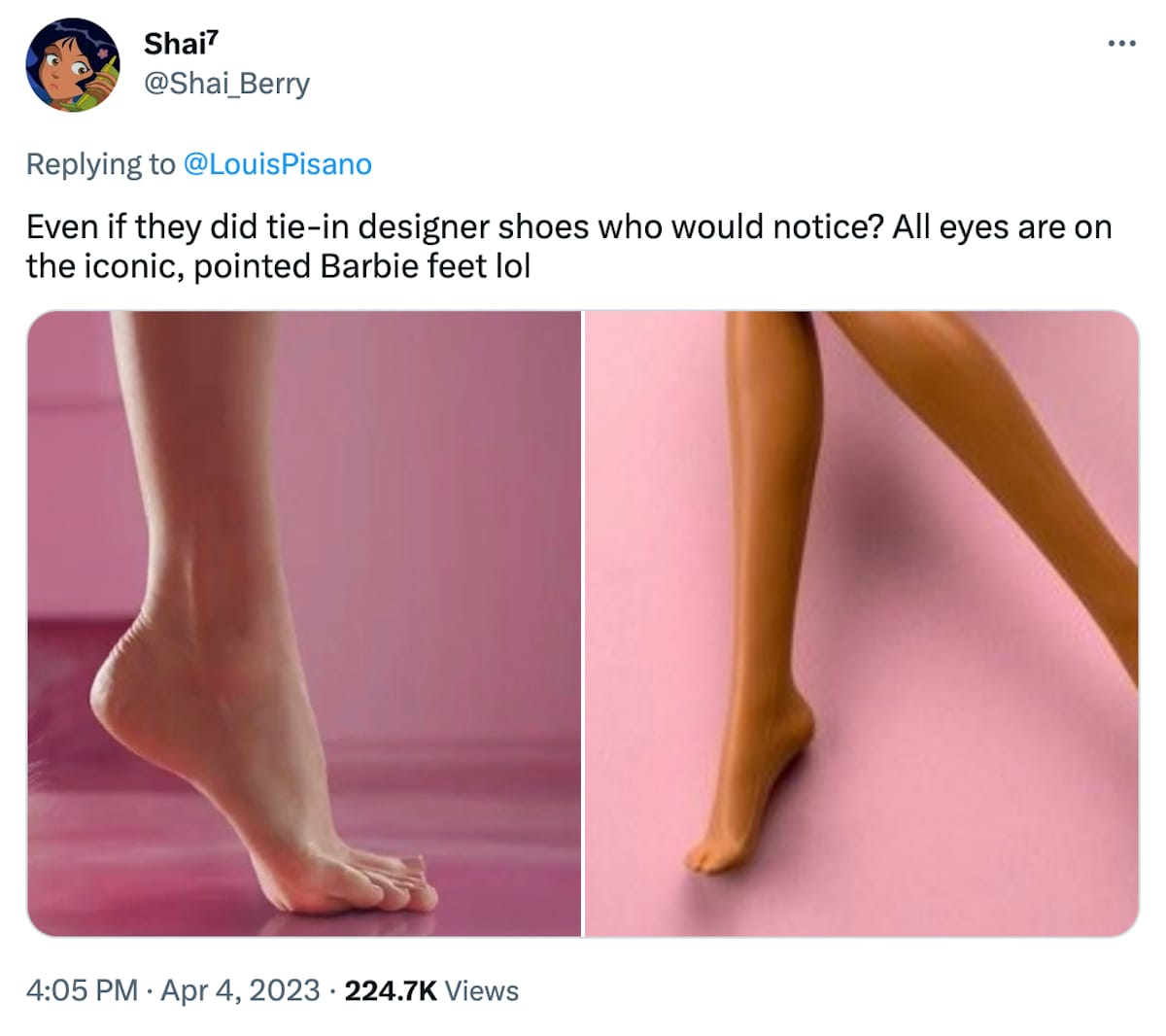 Some have appreciated Gerwig’s attention to detail in the stills that some have torn apart analyzing. Many noticed Barbie's extreme arch as Robbie walks on her toes in the trailer, echoing the unnatural shape of doll's feet. And film critic Jillian Chilingerian picked out a Citizen Kane reference in a Barbie-as-president scene.