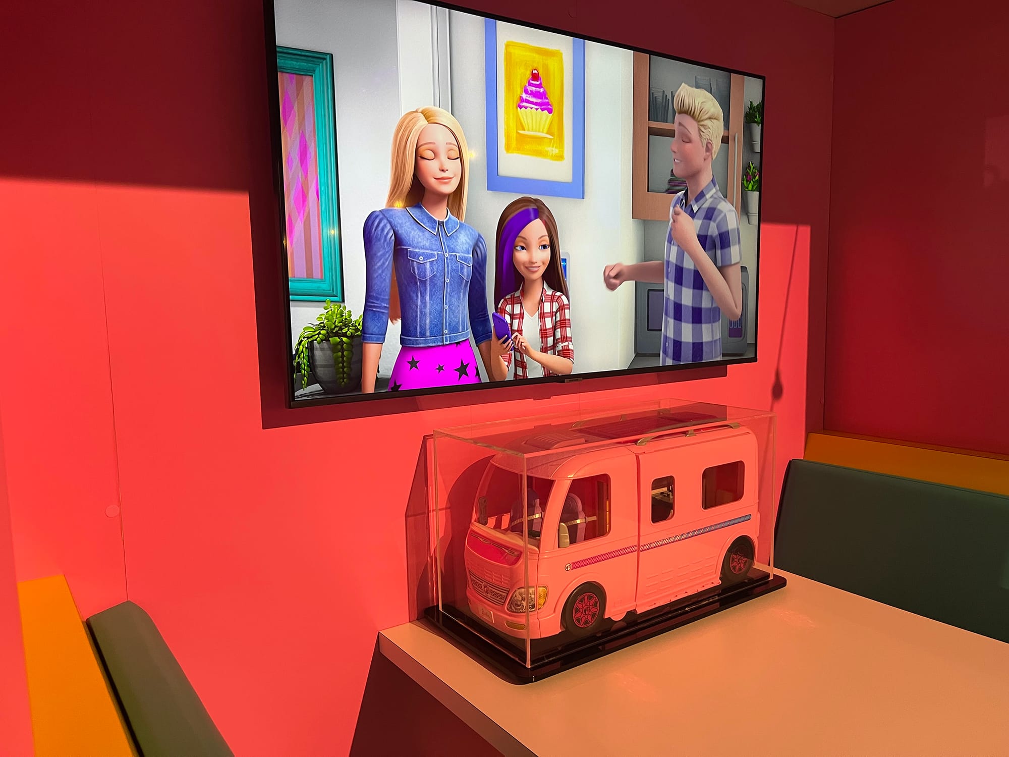 It’s a step and repeat display of Barbie’s careers and lifestyles: fashion editor, astronaut, president, and influencer. An Interior Design Studio features a Memphis-style kitted boudoir and workroom, evoking girl-boss artifice. Self-broadcasting expressions is emphasized, as indicated by a TV studio anchor desk and recording-cum-karaoke booths that allow kids to jam to Katy Perry’s “Firework” or One Direction’s “What Makes You Beautiful.”