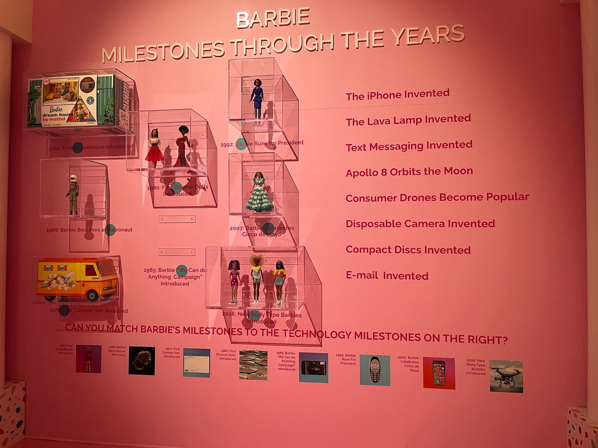 The museum’s didactics are illogical: “Can you match Barbie’s milestones with technology milestones?” A suited-up 1992 Barbie for President is somehow connected with the moment when the first SMS text message was sent, whereas the 2016 landmark “new body type” Barbies coincide with the rise of consumer drones. Your takeaway, of course, is that Barbie is singular. The kids that pass by are encouraged, with this historical context, as well as the many selfie closet set-ups and broadcasting studios, to position their subjectivity adjacent to this objectification.