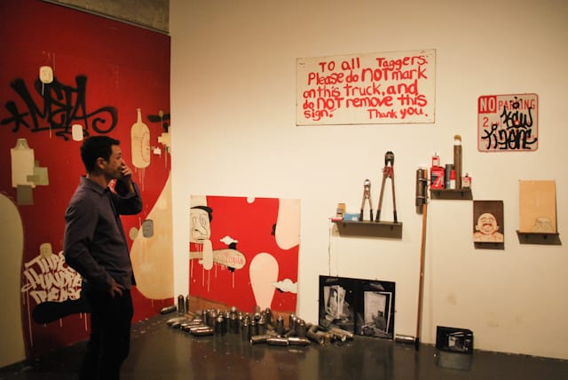 Although I came to admire graffiti artists partly for their work’s daring nature, a skeptical part of me wonders if McGee’s show was too interested in proving to the viewer that McGee still has ‘it,’ meaning his raw edge that attracted attention for him in the first place. Why else have animatronic versions of McGee scattered throughout the exhibition, tagging the museum walls (above)? Or why have installations proudly displaying bolt cutters and stolen anti-graffiti signs (below) except to drive home the fact that McGee is in fact a graffiti artist, not just a museum artist, to separate himself from that crowd. When compared to artists like Fairey who seems to be mostly making t-shirts and hats instead of tagging walls, (see this Youtube video where Fairey’s wife lets slip that Fairey hasn’t gone out tagging in awhile) McGee seems to be fundamentally more committed to the streets, but the way he shows it feels somewhat contrived.