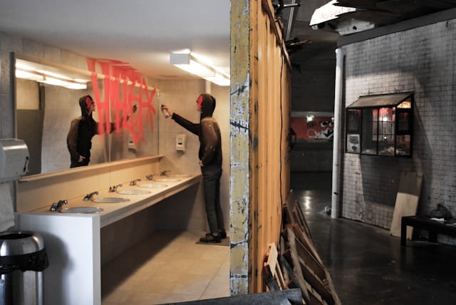 What immediately struck me most about the show was it’s constant reiteration of McGee’s obsessiveness. The animatronic sculptures (some of which are pictured below) and life-like versions of McGee loudly and ceaselessly spraying walls in the gallery was overwhelming, and I got the sense that McGee’s artistic energy is too. Coming into fame with the likes of other noteworthy street artists like ESPO (Steve Powers), Shepard Fairey, and more, McGee has maintained his artistic practice on many levels. While his museum installations are immense and impressive, one gets the feeling he is often still out at night tagging trains and bathroom walls. Part of the success of McGee is his passionate commitment to street art while also successfully navigating museum setting.