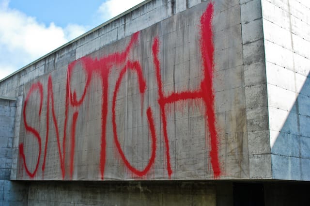 However, documenting a street artist’s work is often an overwhelming task. As I said about McGee in a recent post about SFMoMA, McGee seems to tag everything everywhere, photograph everything, and consider his lifestyle an inherent part of his work’s value. How else could an exhibition of his exist without that being made clear, unless the quality of the work was compromised. In the same way that McGee’s street art found itself in the spotlight, the myth of the artist and his museum shows continue on the same path but noticeably with a larger budget each time. We feel this as we enter the museum through it’s tagged doors and explore it’s chaotic galleries, but I felt awkward about this staged spectacle when on the outside museum wall there is a banner with a fire extinguisher tag reading “snitch” masquerading as a real tag (pictured below). The banner tries to look like the ‘real’ wall behind it, but it isn’t, this was the only moment when I felt a real dissonance with a street artist showing in a museum.