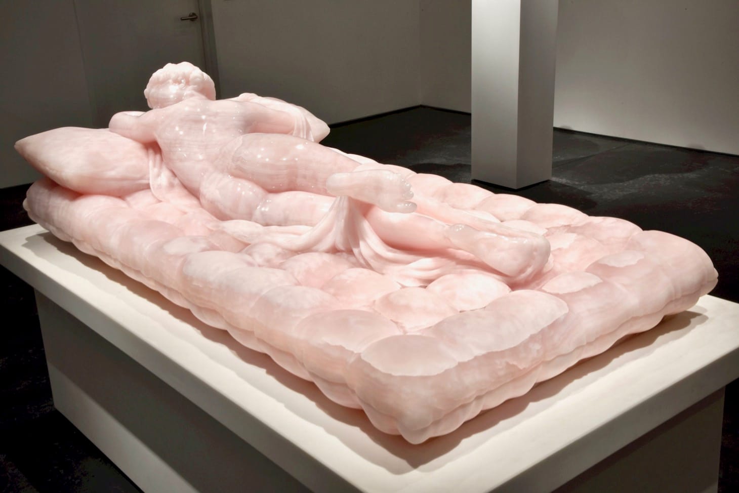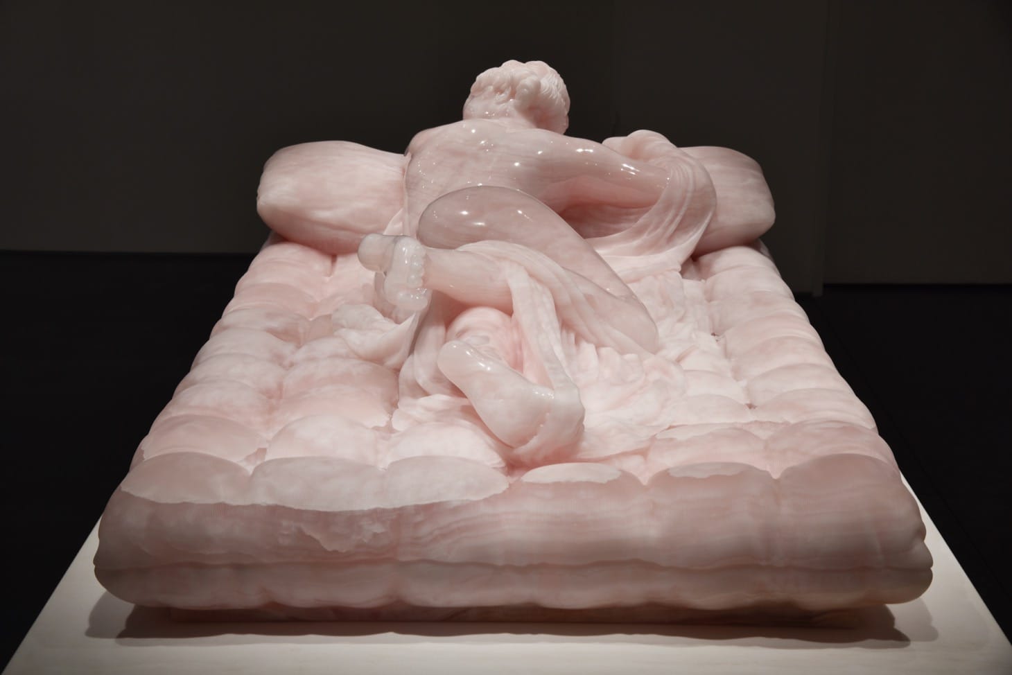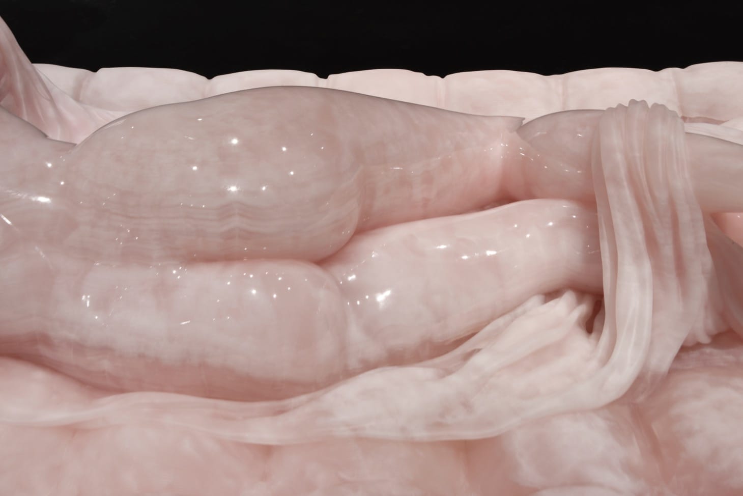 The piece, “Sleeping Hermaphrodite,” (2008–17) corporealizes all manner of contrary notions and feelings: It is colored pink similar to the inside parts of our orifices, but is made of Iranian onyx, not tender, feeling tissue. Both the form and the pose and its prone position suggest sensual indulgence, either the figure sleeping, or desiring or waiting for one to sleep with. But its creation is not a reprise of the Pygmalion story; the figure is not animated by love. Instead it is birthed through a process of picture taking, three-dimensional scanning, and a machine milling technique. The maker’s hand comes in only at the end stage, to polish the stone. Perhaps the most provocative of its contradictions is that the figure has both breasts and a penis.