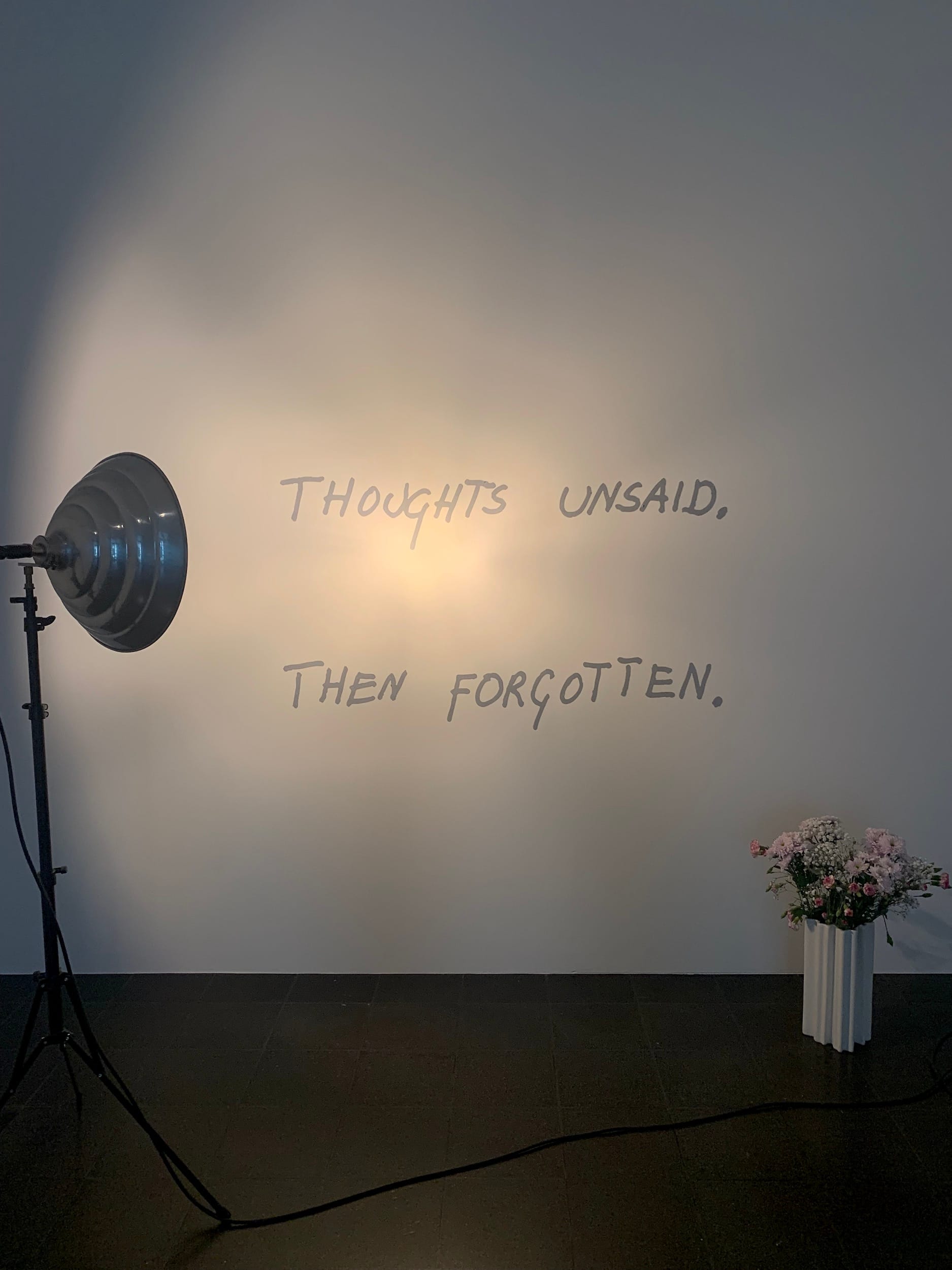 Some later works are revived or reconstructed, like “Thoughts unsaid. Then forgotten” (1973/2023), an installation consisting of the above phrase written on the wall, and a bouquet of flowers: As the flowers wilt, the phrase is painted over, a gesture of erasure and forgetting. The exhibition’s final space includes the first part of the unfinished In Search of the Miraculous trilogy, for which Ader walked with a flashlight through desolate areas of Los Angeles from nightfall to sunrise. Photographed by his wife, Mary Sue, the 14 still black and white images show him wandering through a dark, lonely dreamscape, ending with a final seaside shot. The room is otherwise filled with evidence of his unfinished last work: documentation of his tiny sailboat, a film of the choir that sent him off, photos and Super 8 footage of the boat’s launch, newspaper articles from shortly after his disappearance, even the very sextant that Ader used as a navigation tool.