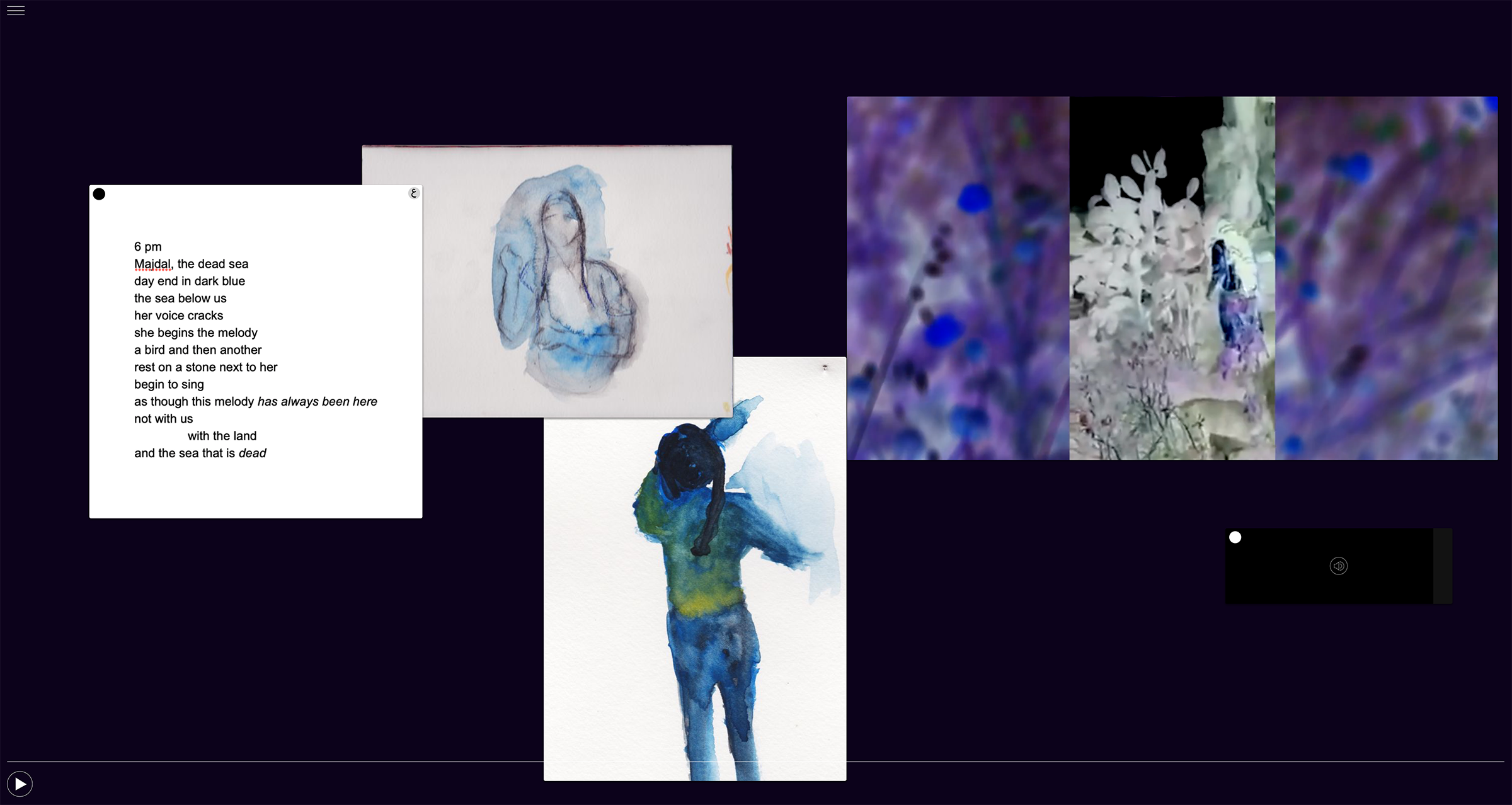Abbas and Abou-Rahme bring a DJ-like precision to the project’s score, which plays a significant role in engendering intimacy through headphones. (Alongside the Palestian DJ Muqata’a, they’re part of a sound and image performance group called Tashweesh.) Ethereal soundscapes drop down into propulsive subwoofer-esque bass levels or flow into melismatic Palestinian communal chants. In a way, these sonic fragments isolate the samples into single channels that shift and move like gradients. Meanwhile, windows imaging a female-presenting figure captured in a blue and purple watercolor-wash crop up next to a pop-up video loop of fists clenched (her in real life, perhaps), punching repeatedly into the air in self-defense-like movements.