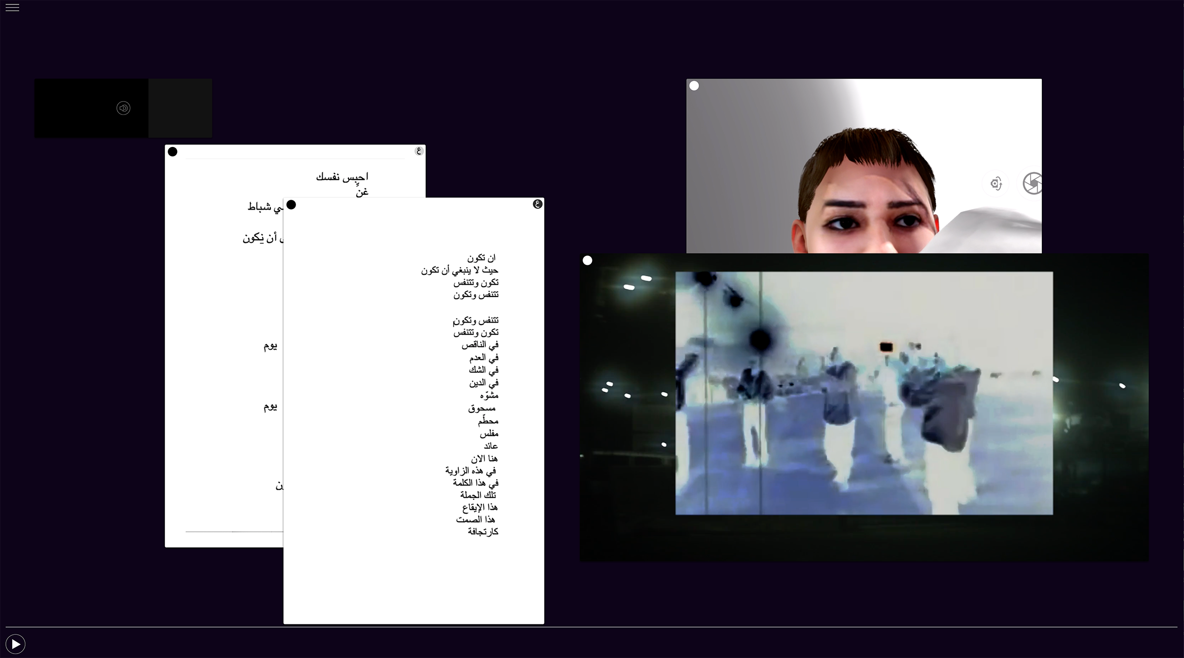 Despite all of this playing out via a website, the artists manage to transmit a similar sense of immersion to what one often experiences with a multi-channel installation. But there is also an ease of accessibility: the text boxes toggle easily between English and Arabic, and a taskbar-like navigation system permits viewers to experiment with duration and functionality, like enabling a sound tracker or jumping ahead to different scenes. Cycling through a meta-textual hard drive of materials, looking through past samples and work, viewers are able to take this in at their own pace. They can pause and attempt to make sense of what it means to be “in the negative” — a common refrain throughout the work to describe a post-extracted state of being, heightened by a year that stopped, and almost feels erased already — but also to live in what the artists describe as a “constant state of mourning.”