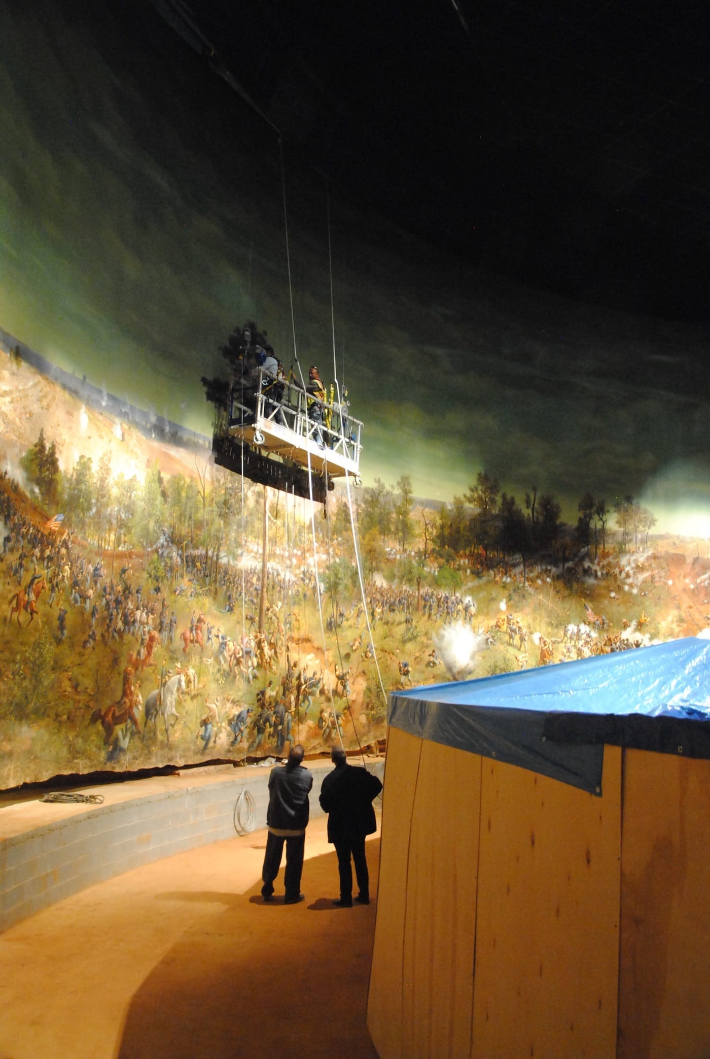 Only three complete 19th-century cycloramas survive in North America, with the other two being the “Cyclorama of Jerusalem” in Quebec, which depicts the crucifixion of Jesus of Nazareth, and the Gettysburg Cyclorama in Pennsylvania. Other panoramas exist — such as the 1,275-foot “Whaling Voyage Round the World” now being conserved at the New Bedford Whaling Museum — but cycloramas are distinct in their 360-degree displays in specially-designed circular architecture.
