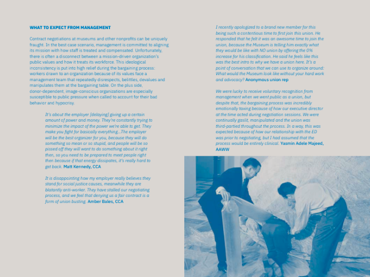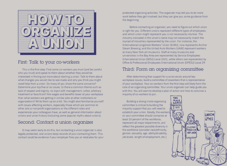 The second part of the series, released earlier this year, guides workers through the difficult process of negotiating a union contract. It breaks down the challenges of the bargaining process with contributions from workers who successfully unionized at the New Museum, MoMA PS1, the Frye Museum, and others. The online version of the booklet also includes a Google Drive folder of example contracts, links to organizer resources, and a wage proposal calculation spreadsheet.