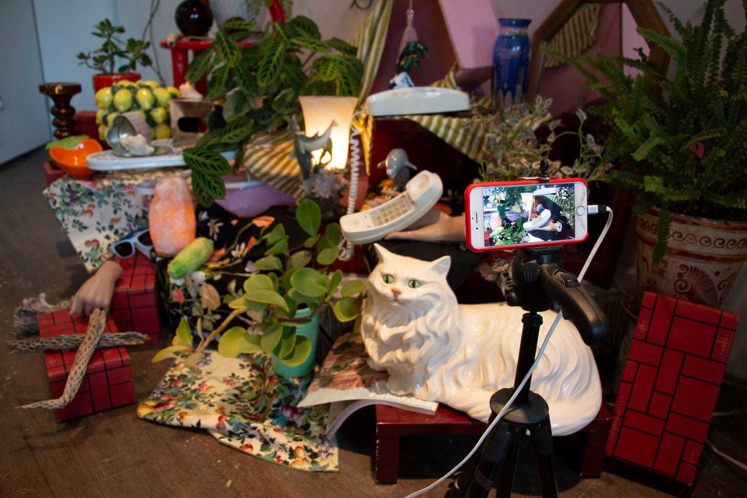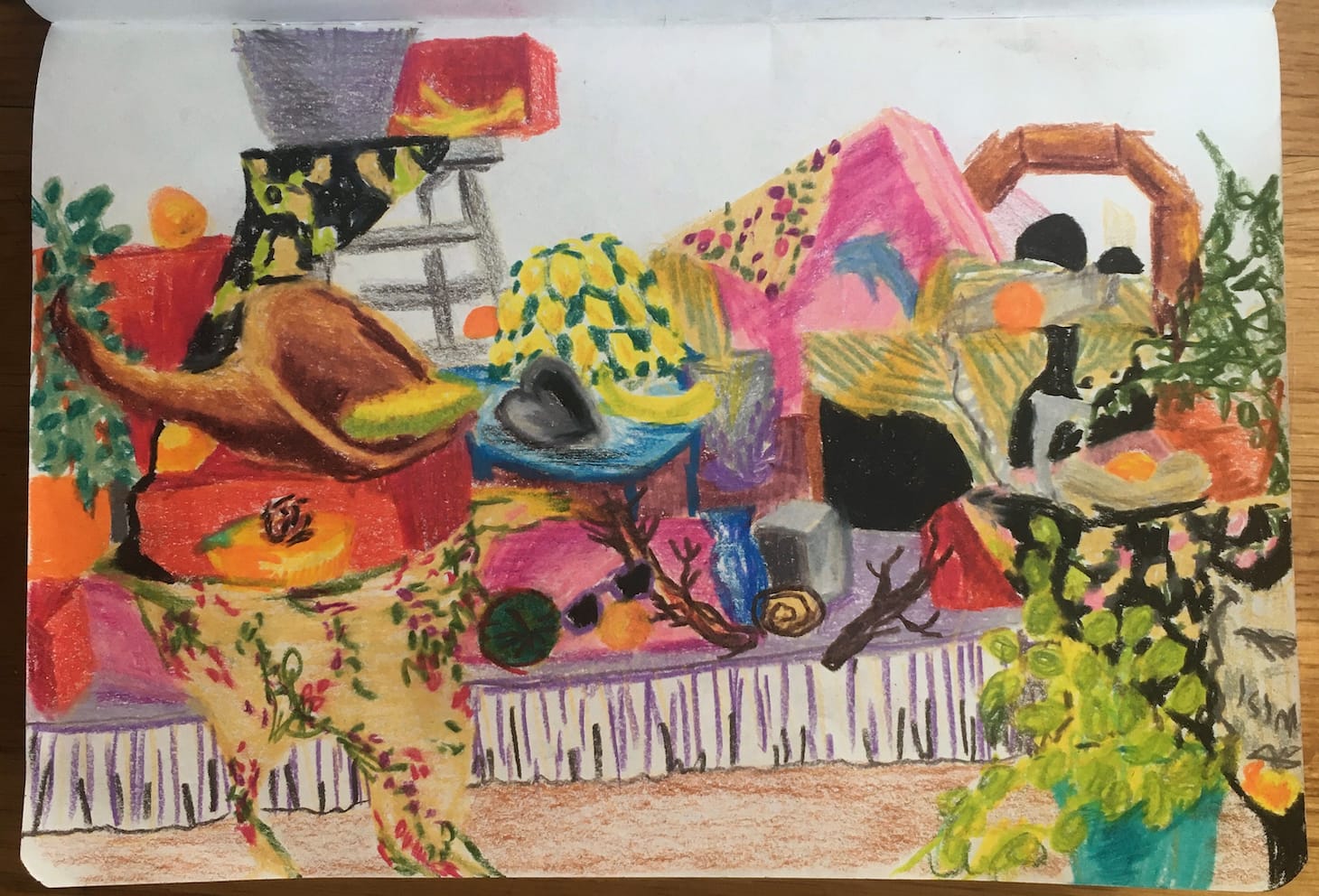 For the Zoom session, Cammermeyer sets up a large still life in her studio and focuses in on different details. In an in-person session, participants would normally build the still life collaboratively; since that isn’t possible, online participants are also welcome to set up their own still lifes to give them more choice. That said, Cammermeyer’s most recent setup looks like a lot of fun, bursting with color and eclectic props like ceramic cats and dolphins. While the artists generally like to incorporate flowers into the still lifes, they’ve veered away from purchasing these and are instead “incorporating living plants and foods that can be utilized post-session.” After the session, participants are welcome to share the images of their drawings to be posted on Be Still Life‘s Instagram.
