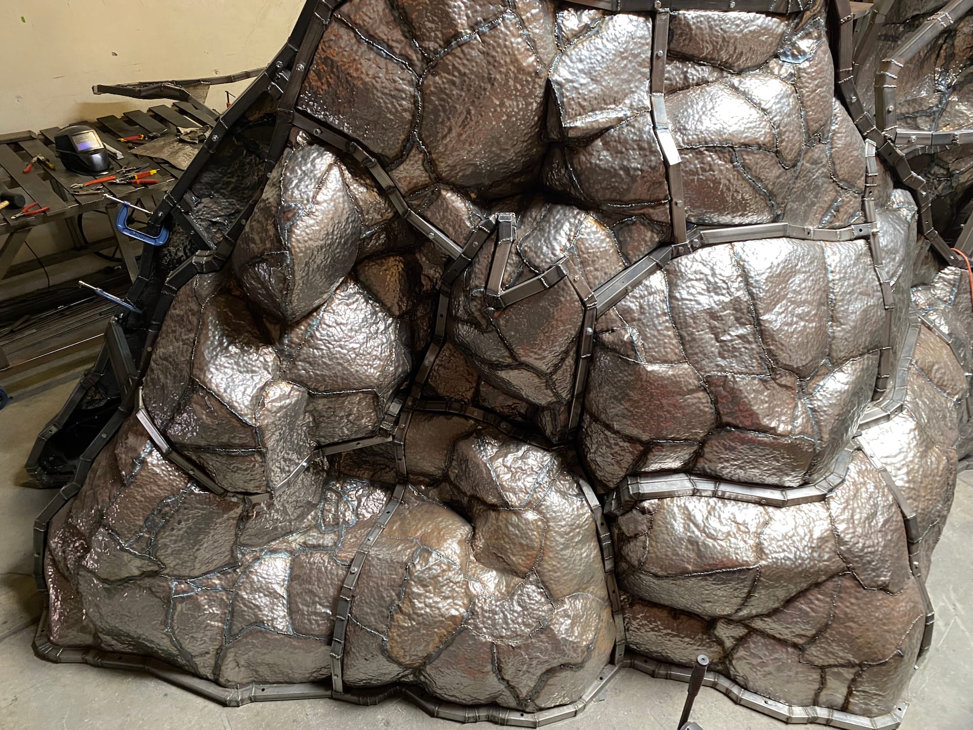 Cortez’s version of Ilopango is an organic patchwork of hand-hammered steel panels welded together around a skeletal armature that allows it to be assembled and disassembled for transit. As no contemporary accounts exist of how it looked, its form is based on conjecture and imagination. As with much of her work, it could be considered a form of Indigenous futurism, fusing Mesoamerican histories and traditions with a hard-edged, hand-crafted anti-colonial vision.