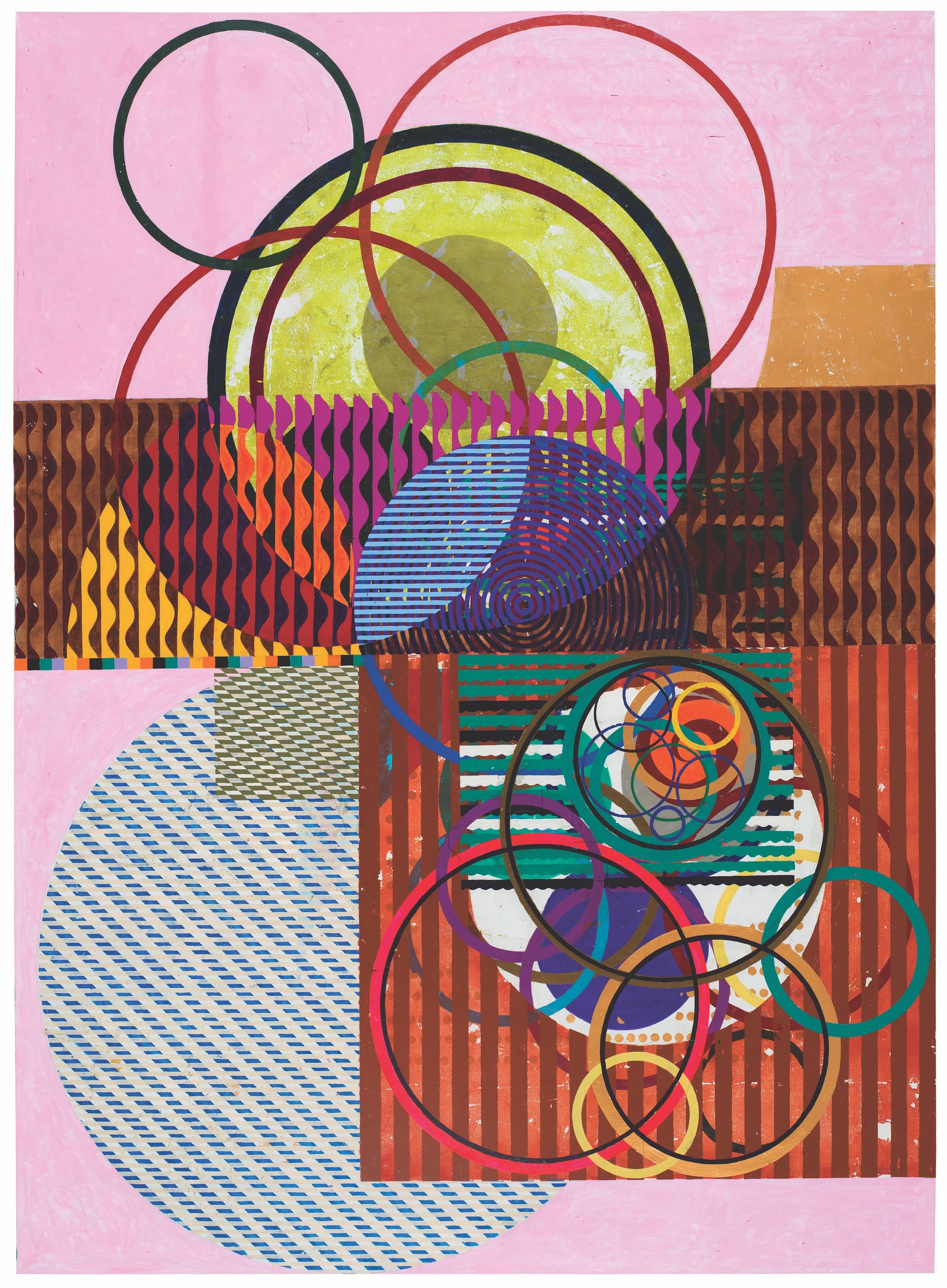 The exhibition offers an engrossing overview of how the artist cross-pollinates painting and printmaking, increasingly favoring collage as her primary method. Milhazes’s “high-low” hybrids — if one considers the unequal status often granted to printmaking versus painting — sustain a productive tension between lushness and crispness, baroque and geometric form.