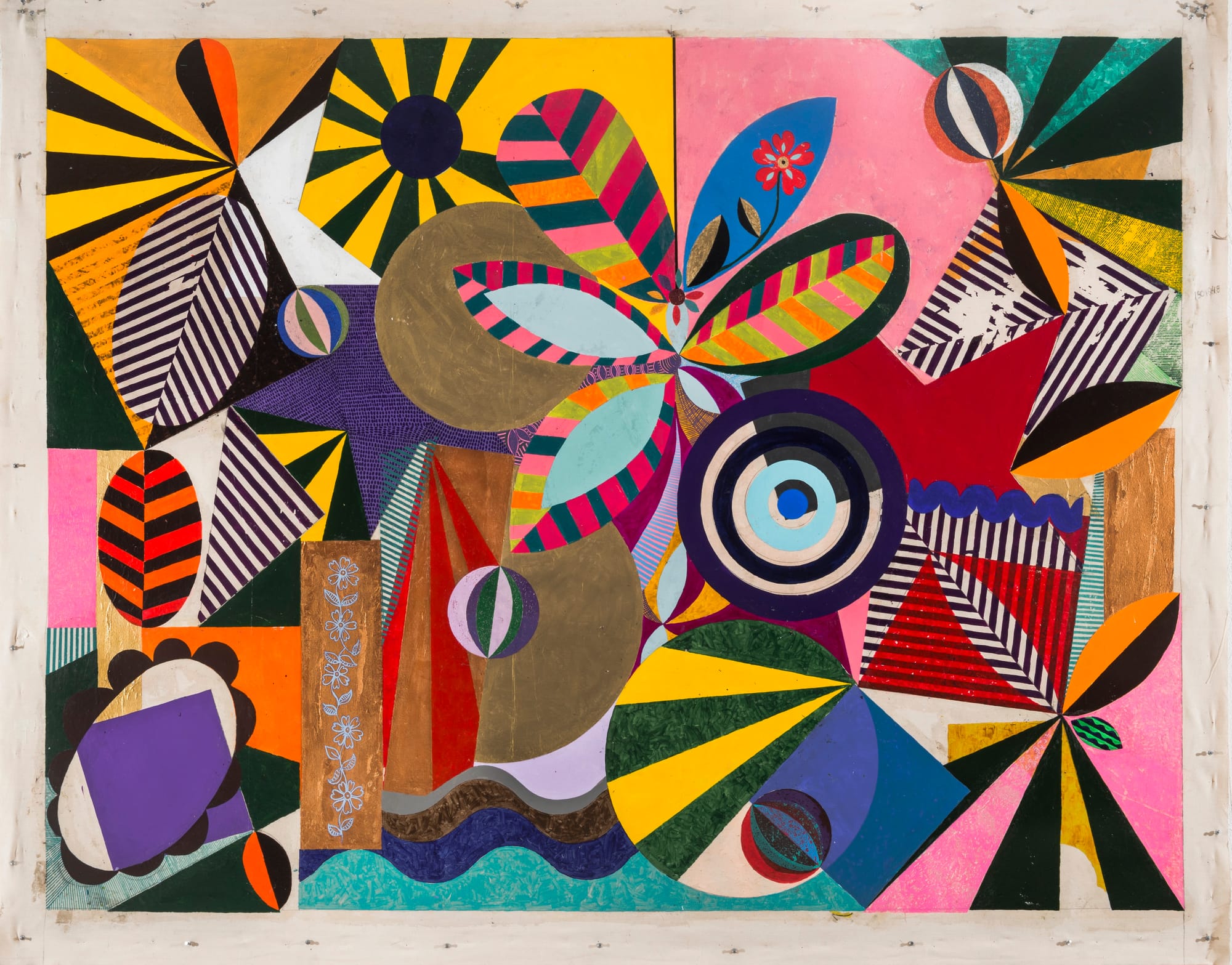 Such homely, quotidian, not to mention historically feminine evocations run through the show. In a joyful, playful fashion, the artist beckons the viewer with convivial titles, such as “Senhorita with her pets” (1993), or “The Popular” (1995) — Milhazes’s nod to her thematic repertoire. Some works are faintly spiritualist. One senses a connective thread extending from Hilma af Klint to the Op Art artist Bridget Riley, who influenced Milhazes. The spiritual and optical-abstract converge in Milhazes’s small acrylic, “Little Church” (2012–2013), its hypnotically inlaid, fiercely luminous flower like a sunlit church rosette. In the wavy, infinitely Venn-diagrammatic wonder, “Potato Dreaming” (2003), geometry itself hallucinates.