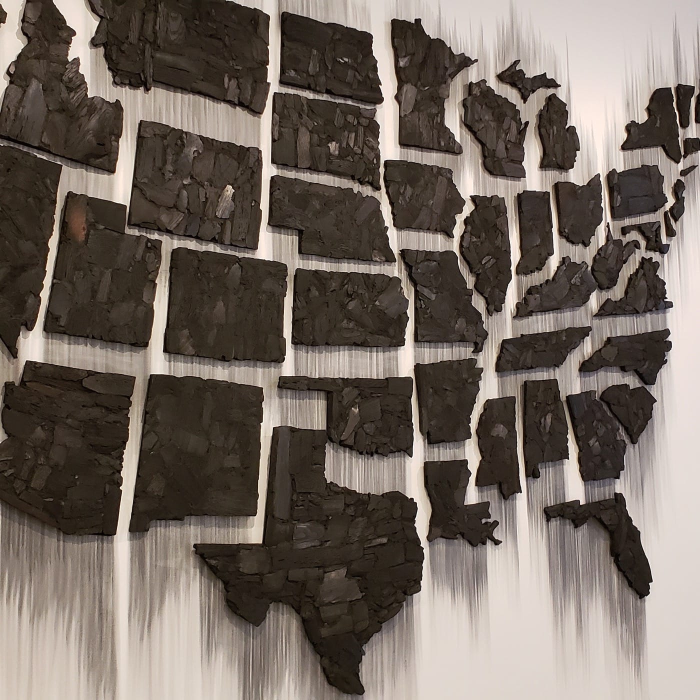 Fernandez presents “Fire (United States of the Americas)” (2017), which uses wood burned into charcoal to reify a map of each of the continental American states. The states are haloed by a streaks of dark ash, and spaced so that the whole seems to be breaking up. One can read the news or peruse any of the popular social media platforms to get the same indication: that our discrete municipalities are becoming balkanized, and more loudly so, as we debate law, policing, LGBTQ rights and recognition, teacher pay, immigration, military intervention, and taxation policy. Unlike a generation ago, these turbulences cannot be abated by rhetoric or a patriotic ideology, which so often is racialized and blinkered. I think of Sylvia Plath’s poem “Elm,” in which the speaker almost seems a surrogate for the the nation itself: “Now I break up in pieces that fly about like clubs. / A wind of such violence / Will tolerate no bystanding: I must shriek.”