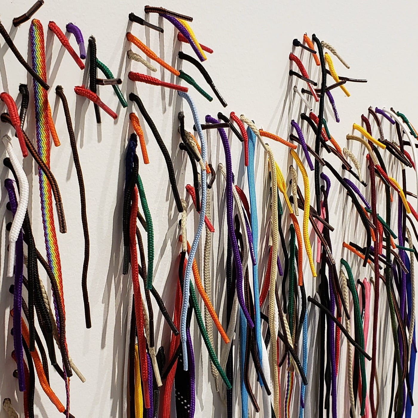 Yet in another room, Nari Ward puts forward the narrative that the mosaic of difference — given enough distance — can combine into a compelling and lovely portrait. Up close and from the side, “Last words of John Brown” (2017) is simply shoelaces of varied colors strung through holes in the wall, so that they fall at varied lengths. From farther away, one sees that the laces form language — a complete sentence, a complete thought: “This is a beautiful country.” True. It is, in places. I know because I have seen them: driving down Pacific Coast Highway from Long Beach to Dana Point on a Saturday afternoon, on which the grandeur of collective endeavors such as coastline-hugging highways seem both necessary and miraculous. These structures make this country navigable and connected, and crucially, they are shared utilities made by people I will never see or know.
