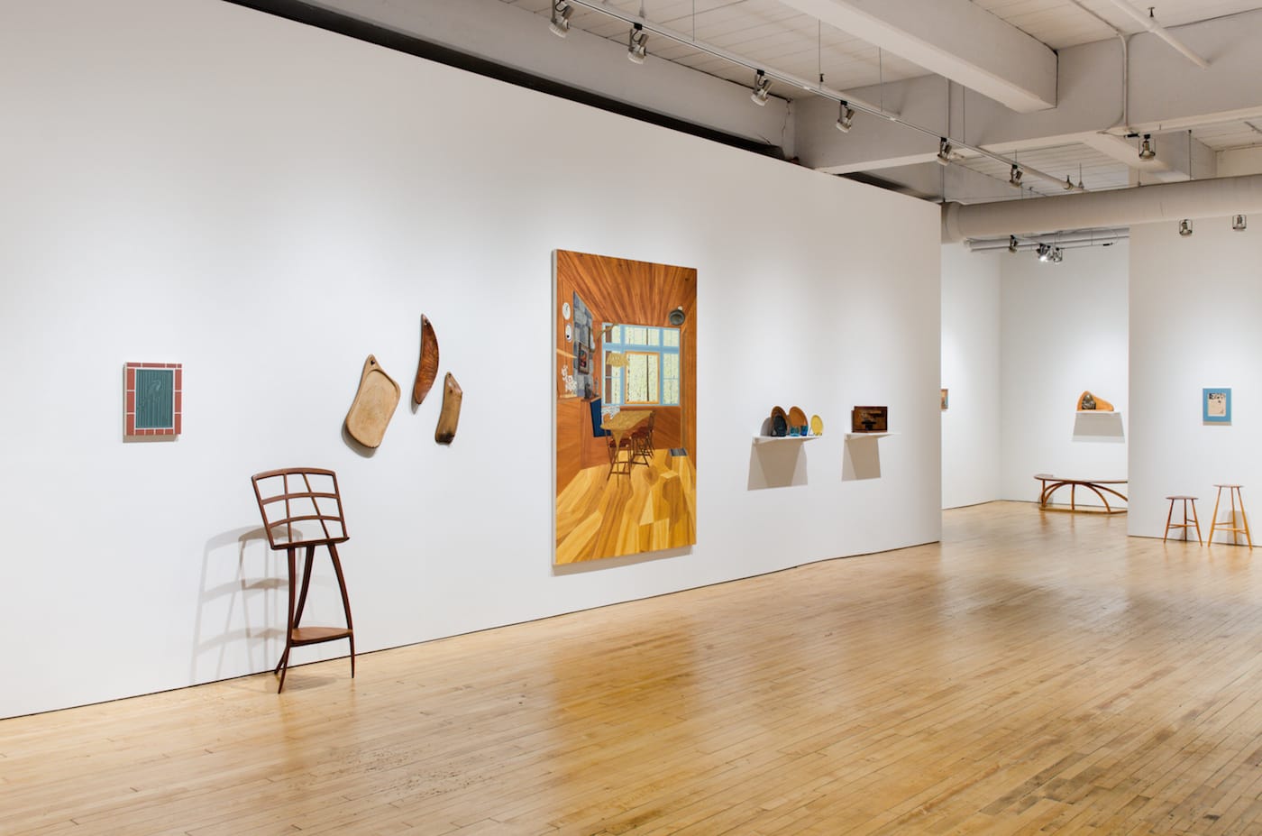 Surreal on another scale are small paintings of Esherick’s maquettes — miniature preliminary models for furniture — nonchalantly sitting on shelves between art and design books. These paintings are small windows to a secret world, depicting tiny shelving systems. The actual maquettes are displayed elsewhere in the gallery, as are various playfully designed stools and chairs that appear in Suss’s paintings. These sculptural elements enhance a feeling of familiarity and unreality in her interior paintings, like a vision made manifest. It blurs the timeline between these two makers: perhaps the objects were sculpted from the paintings.