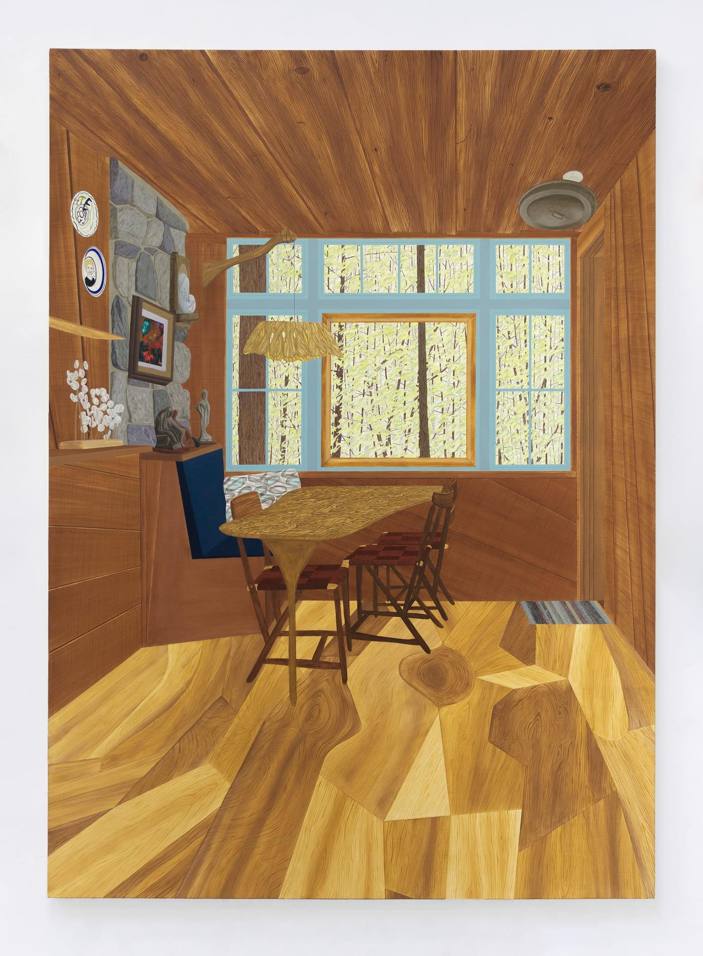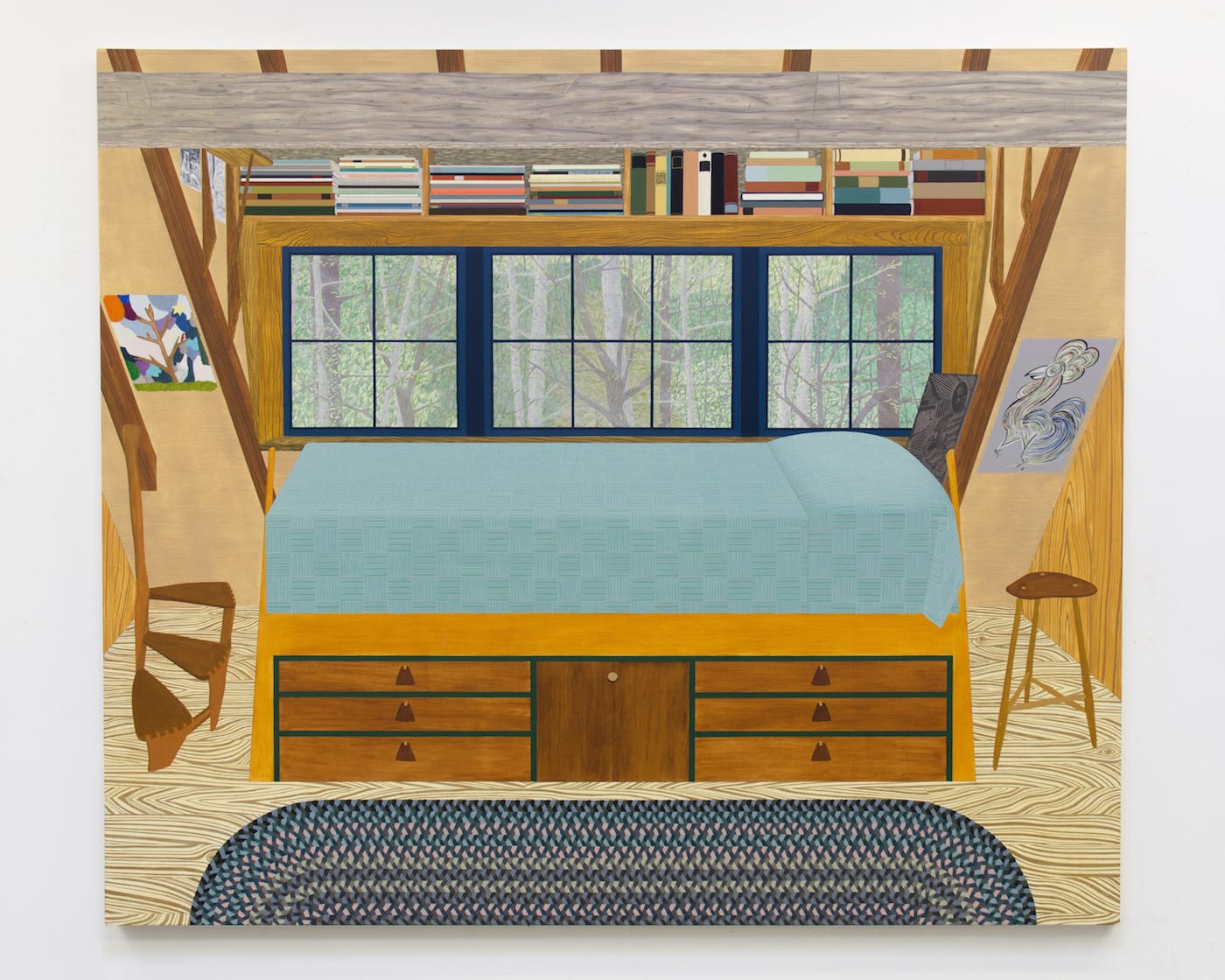The perspective in Suss’s paintings is often from a slightly lowered eye level, like that of a child, giving her interior spaces an uncanny, dollhouse-like sensibility. Three large paintings present interiors at a near-lifesize scale; they operate as portals into the Wharton Esherick House, providing a real sense of its complexity: challenging acute angles in the architecture, dense natural textures of rock and wood, braided and woven textiles. Suss’s obsessive rendering maintains intense focus on every detail of Esherick’s carefully constructed interiors, from the upholstery to the floorboards to the stacks of notebooks and papers on his desk.