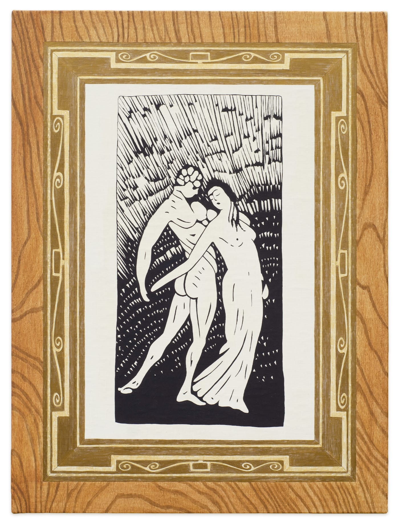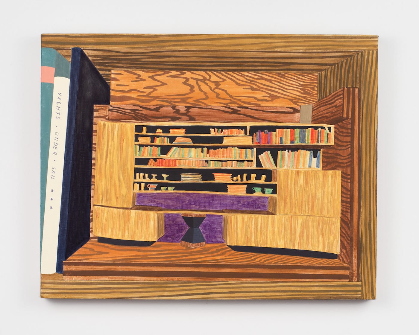 A shared appreciation for the dynamic qualities of wood grain flows seamlessly from 2D painting to 3D sculpture. Esherick’s wooden objects are carved with a sensitivity to the grain’s undulations, and Suss revels in its patterning where it appears in Esherick’s home: bookcases, floors, walls, chairs, and ceilings vibrate with vivid veins of warm browns and yellows. A series of small paintings depict four woodcut prints by Esherick, hung in hand-carved wooden frames on an unpainted wooden wall. Rendered through Suss’s flattened perspective, these surreal, trompe l’œil investigations of Esherick’s influences — the Expressionist woodcuts, the Deco frames — demonstrate a deep collaboration between the artists.