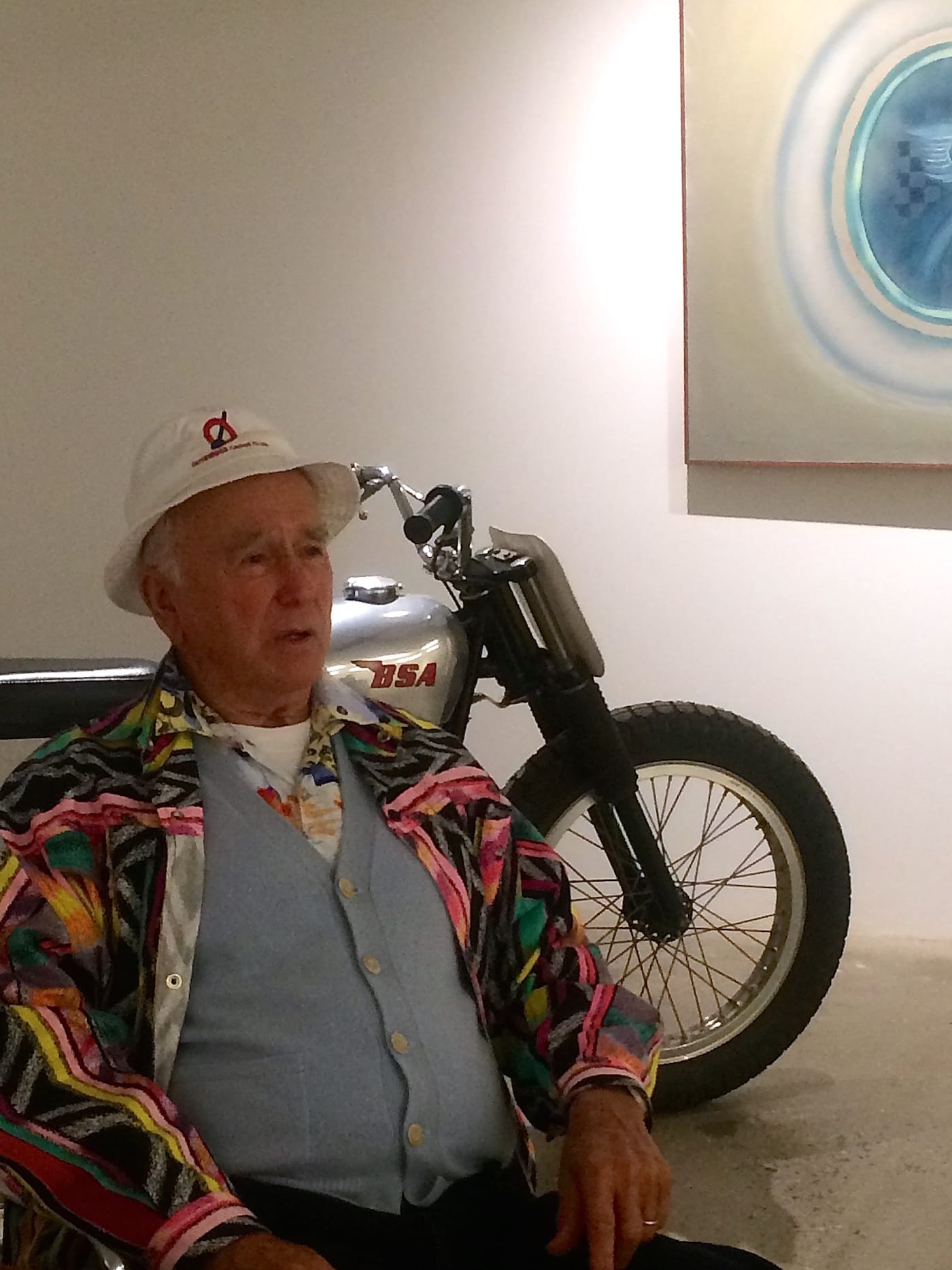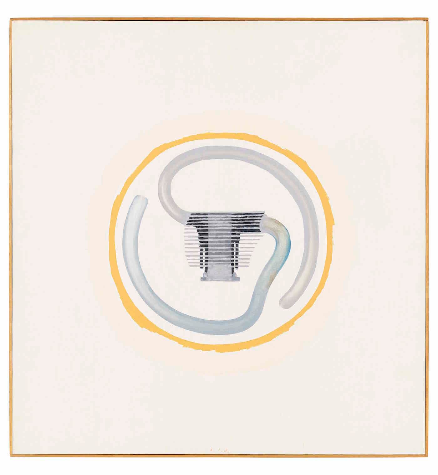 Bengston embodies the California cool aesthetic — his lifestyle (surfer, motorcyle-racer, rule-breaker) is interconnected with his work. His is an aesthetic that fuses Pop and Finish-Fetish with a resolute commitment to hand-craftsmanship. The B.S.A. paintings may depict icons and motorcycle parts, but they have an aura reminiscent of the radiating, centralized geometry found in anonymous Tantra paintings. For him, good art is transportive, an athletic feat, and above all, should never be boring.