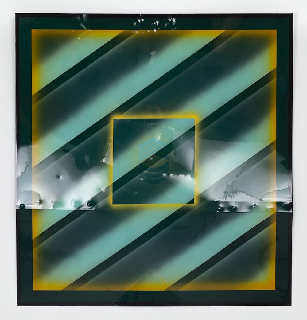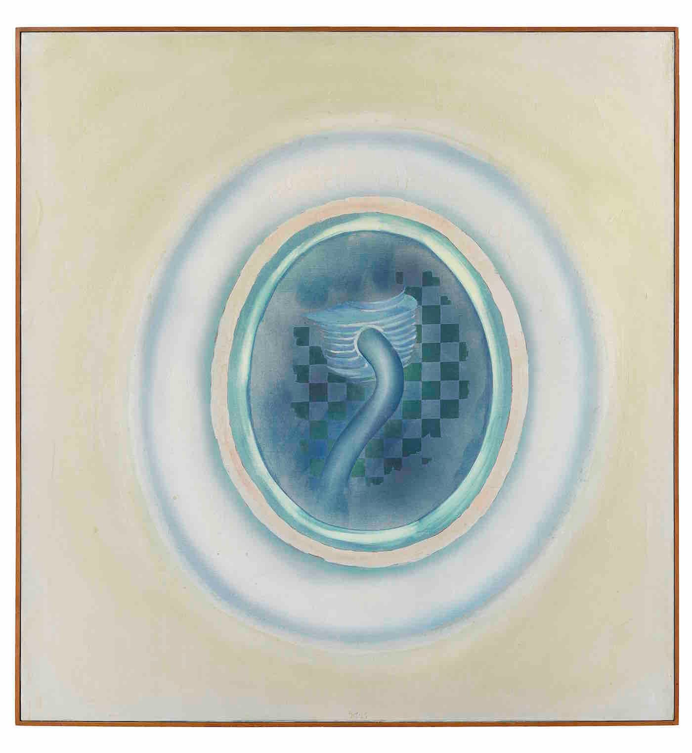 Bengston studied at Los Angeles City College; the California College of Arts & Crafts, Oakland, California; and Otis Art Institute, Los Angeles. Between 1958 and 1963, he had five solo shows at Ferus Gallery. In 1968, he was given a ten-year survey exhibition at the Los Angeles County Museum of Art, for which he enlisted Frank Gehry to create an architectural environment where the paintings would be staged. In addition to the chevron, he has also used the logo of the Iris Sugar Company to make paintings with a centralized flower form. This series is named Dracula because the silhouetted shape was said to look like a flying Dracula, as well as a flower. His embrace of motorcycle and car culture led him to using enamel and lacquer to create highly reflective surfaces on masonite or metal, some of which are then dented and altered with a hammer (“Dentos” paintings). He has been the subject of exhibitions at the Honolulu Museum of Art; the Contemporary Arts Museum, Houston, Texas; the Oakland Museum; and the Corcoran Gallery of Art, Washington, D.C. His work was shown this year at Neuendorf Projects, Berlin; Andrew Kreps Gallery, New York; Franklin Parrasch Gallery, New York; Samuel Freeman Gallery, Los Angeles; and Venus Over Manhattan, New York.
